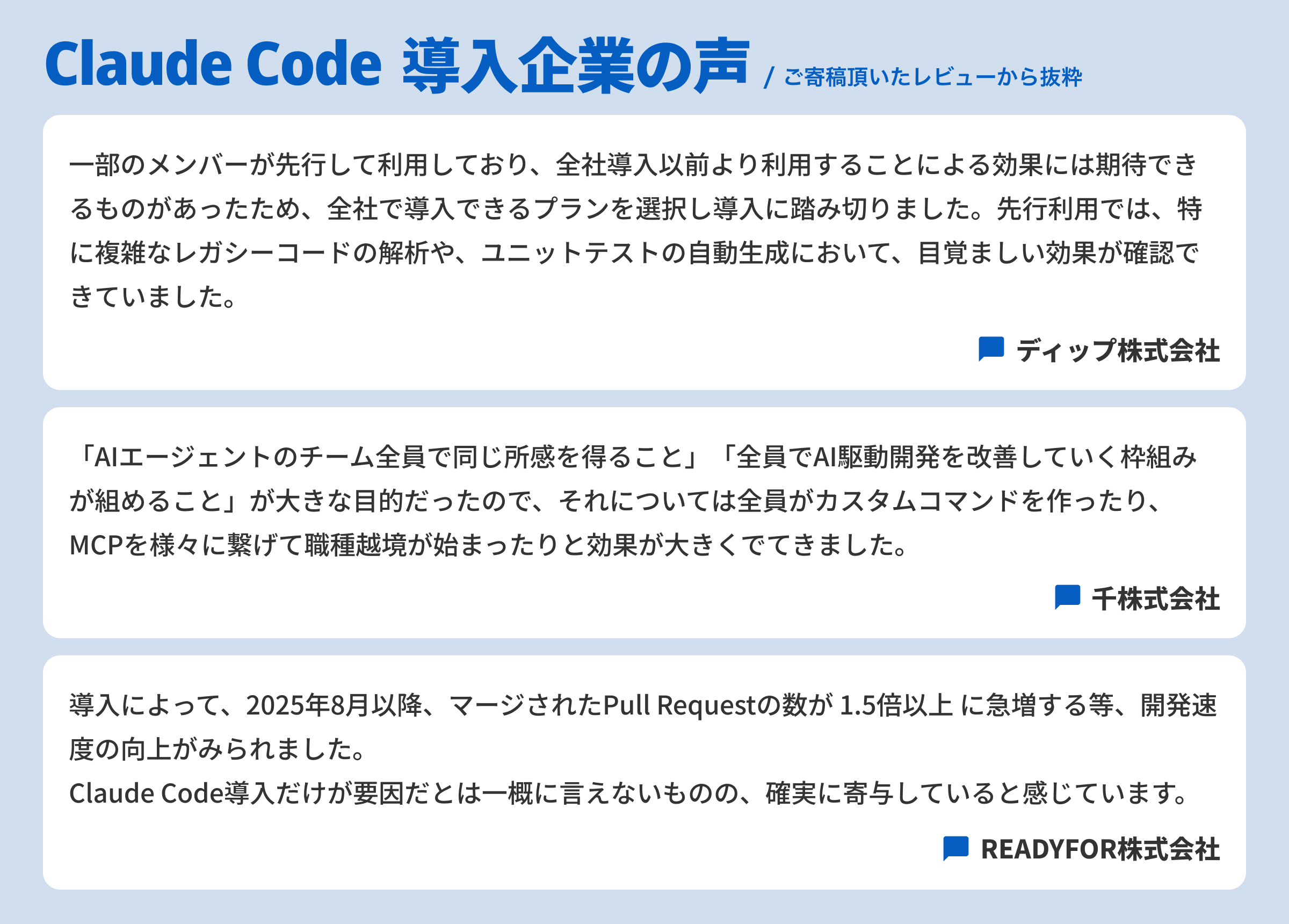 選定理由としては、カスタムコマンドやサブエージェント、MCP等の設定をチームで共有できる点、またデザイナーやPdMも含めた全職種で活用し職種間の壁をなくせることを見込んで導入したという声が目立ちました。