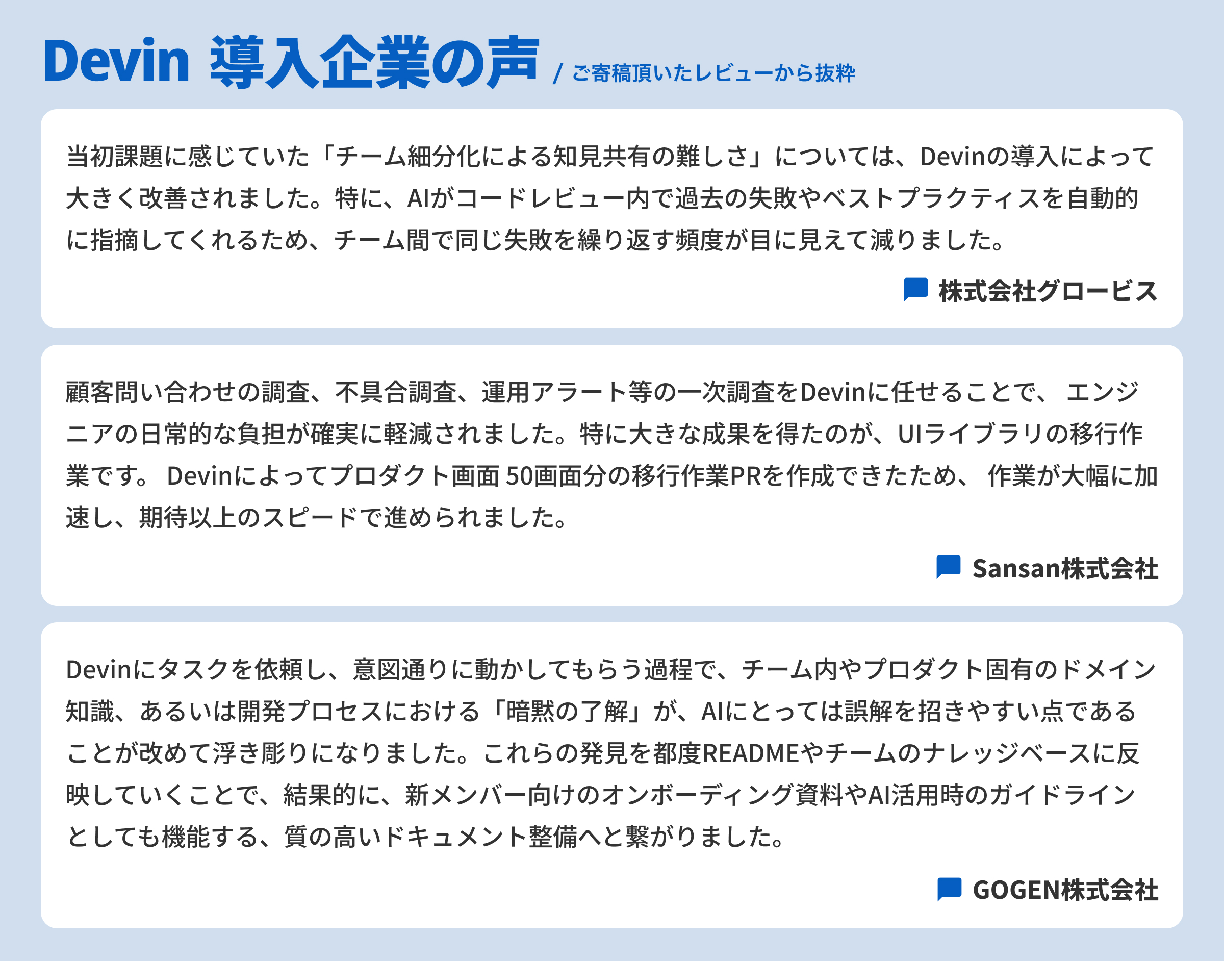選定理由としては、人間がPCを開いていない時間や別の作業をしている裏側で自律的にタスクを進められる「非同期性」を評価しているといった声や、Devinを単なるツールとしてではなく、擬似的な「新しいチームメンバー」と期待しているといった声がありました。