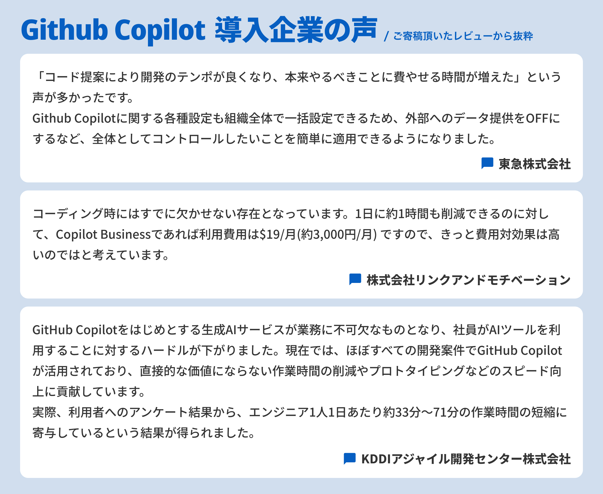 GitHub Copilotを導入した理由として、「GitHubエコシステムとの統合容易さ」や「既存エディタに拡張機能をインストールするだけで導入できる点」、「組織的な管理のしやすさ」を挙げる声がありました。