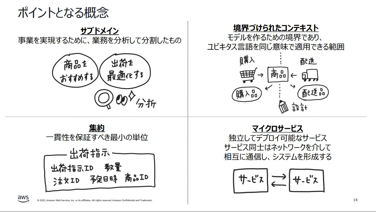 2つ目は境界づけられたコンテキストです。モデルを作るための境界であり、ユビキタス言語を同じ意味で適用できる範囲を指します。例えば「商品」という言葉が、購入の文脈と配送の文脈では異なる属性を持つことがあります。どこで境界を引くかを決めるのは設計の作業です。
