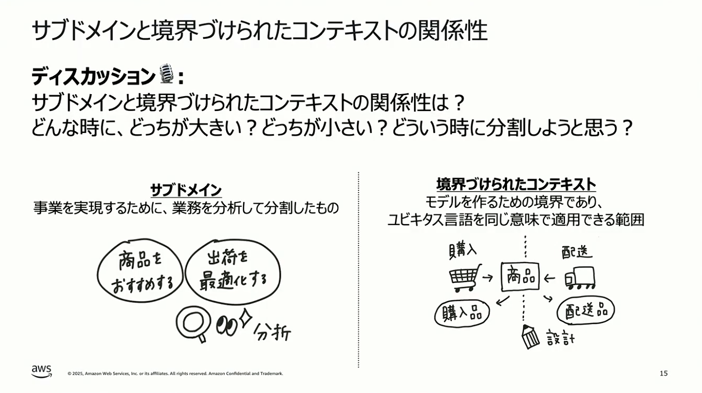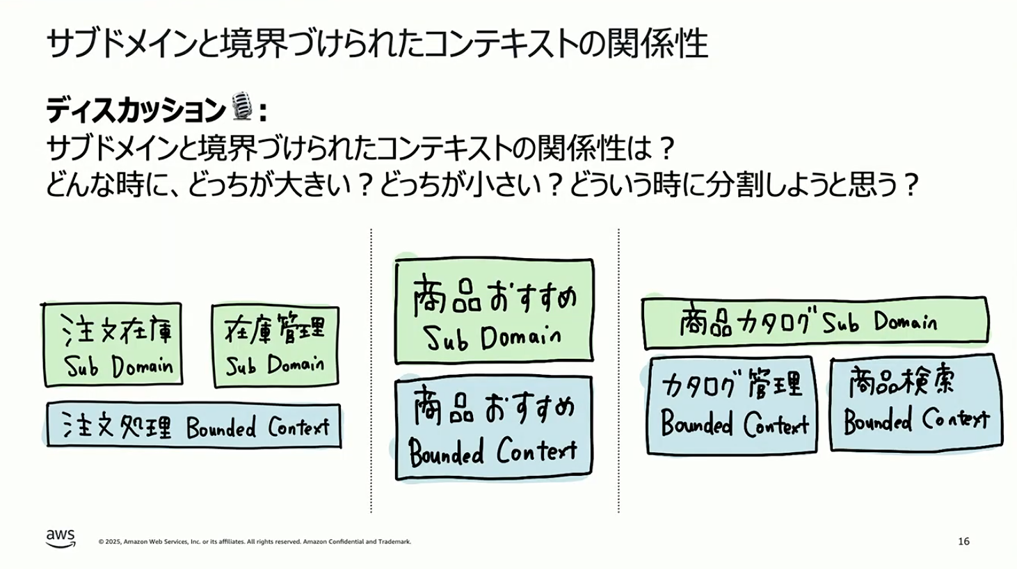 しょぼちむ:先ほど整理したとおり、サブドメインは分析から導き出すもの、境界づけられたコンテキストは設計で定義するものです。一方で、実務では両者の関係性について迷われることが多いと思います。サブドメインと境界づけられたコンテキストはどちらが大きいのか、どういう時に分割するのか、統合するのか、という判断基準に迷われることが多いと思います。