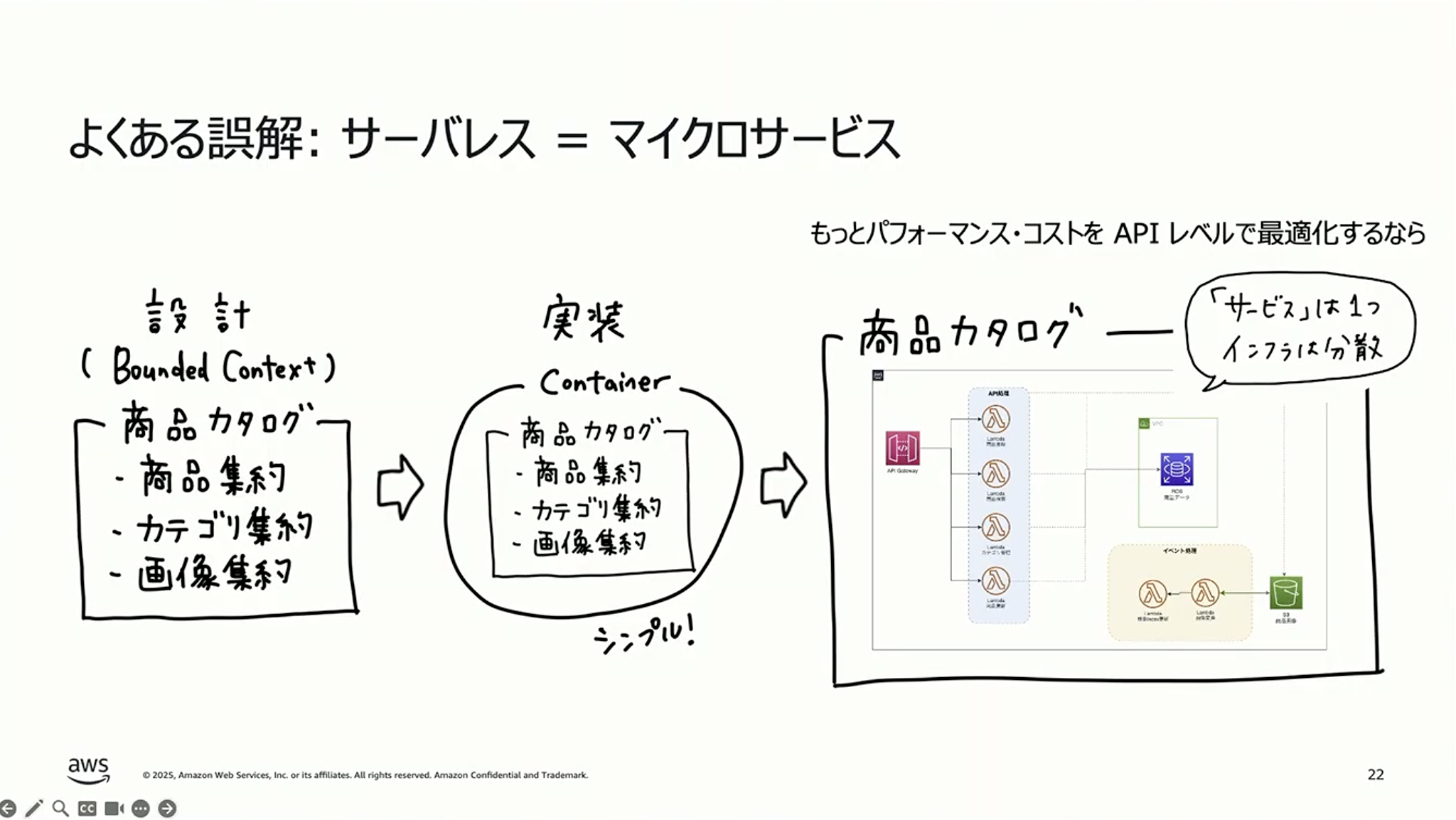 ポイントは、複数のLambda全体で1つのマイクロサービスを構成するという考え方です。この考え方であれば、先ほどの境界づけられたコンテキストとマイクロサービスの関係と変わりません。逆に言うと、Lambda1つをマイクロサービスと呼ぶのは避けたほうがいいと思います。