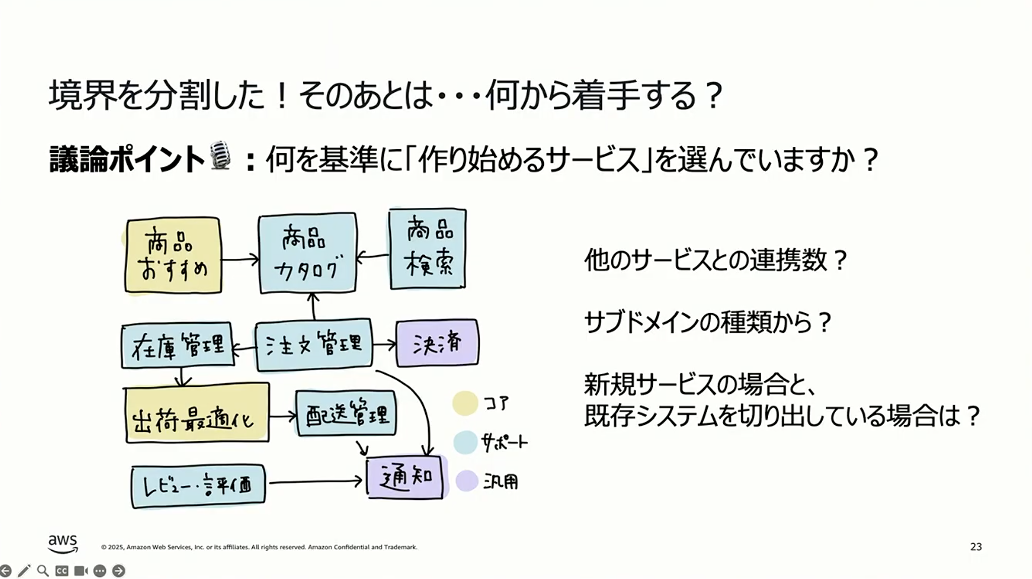 なぜこういうことを意識するかというと、結局我々はビジネスをやっているので、バリューを出さないと「これは何の意味があるの。」と言われてしまうんですよね。例えば配送管理をマイクロサービス化しましたと言っても、「それで何が良くなったの。」と聞かれます。それに答えられるようにするためにも、やはりコアドメインから着手したいという気持ちがあります。