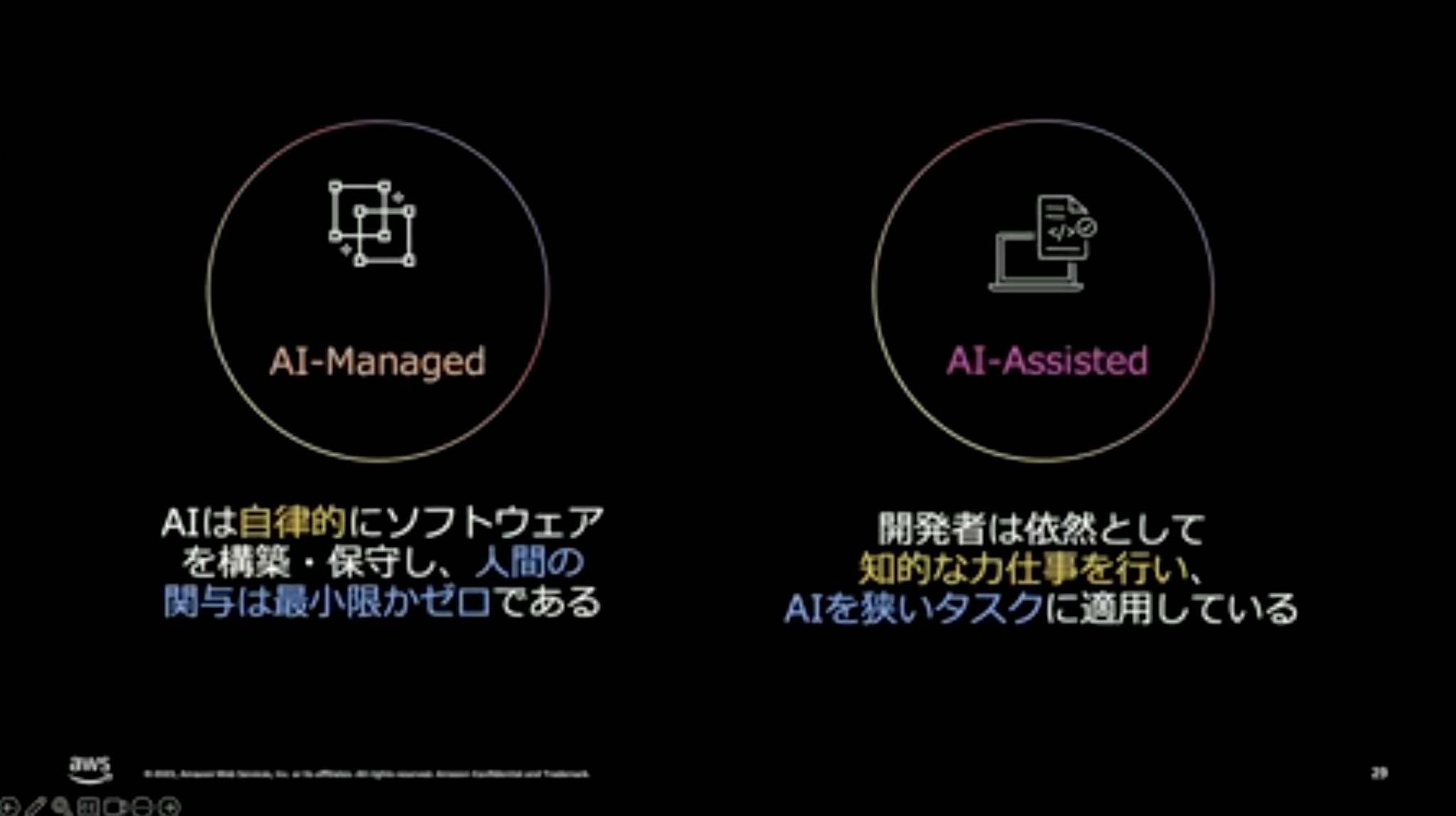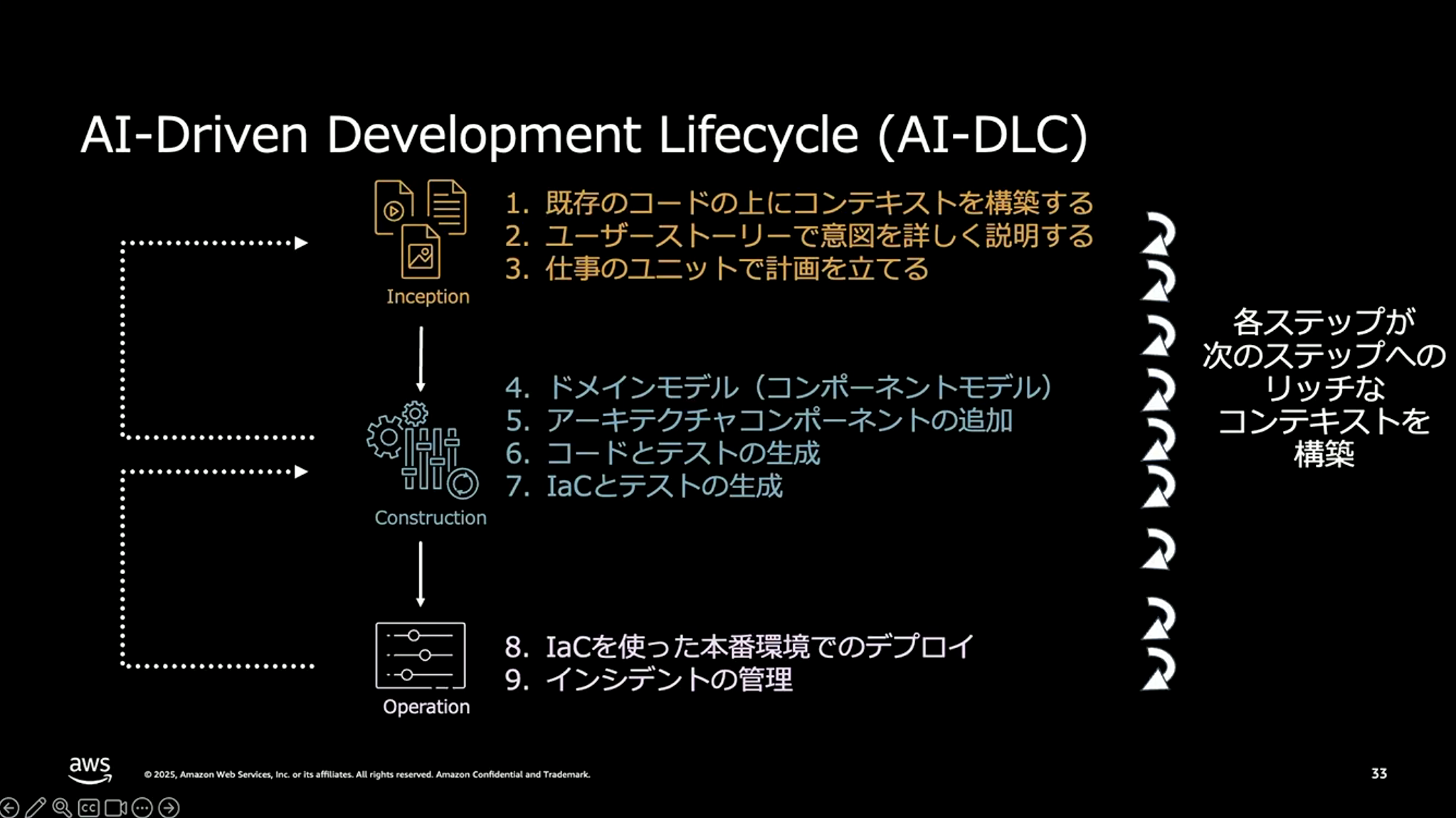 福井:今、AWSでは「AI-DLC(AI駆動開発ライフサイクル)」というものを推進しています。ポイントは、コーディングだけにAIを使うのではなく、要件定義から設計、実装、運用までの開発ライフサイクル全体でAIを活用しようという考え方です。従来の改善は少しずつ効率を上げていくステップアップ型でしたが、AI-DLCでは開発プロセス自体を根本から変えるパラダイムリープを目指しています。