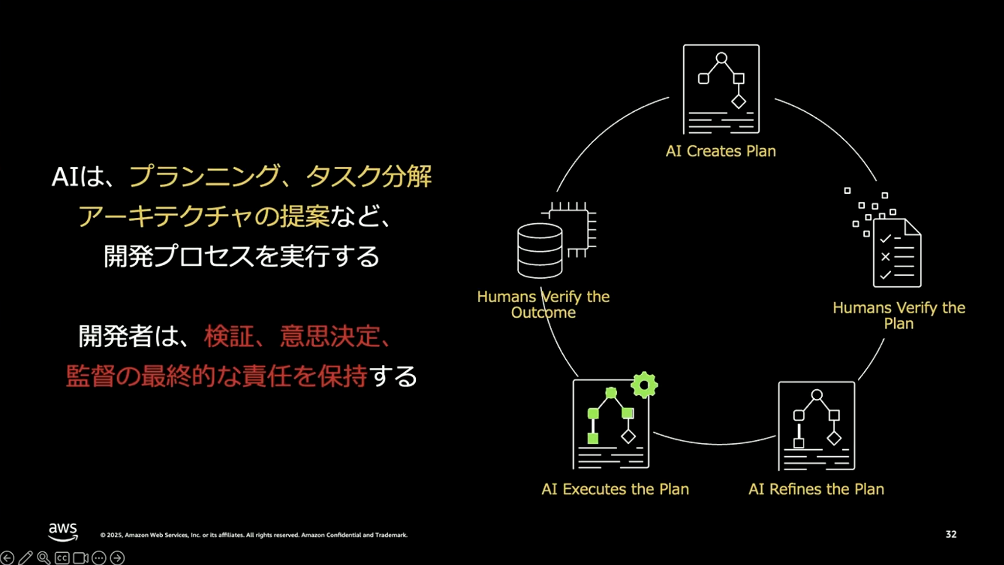 ポイントは、このサイクルをぐるぐる繰り返すことです。AIがプランを生成し、人間がレビューして補正を行い、AIがその補正を反映したものを再生成する。それでOKであれば、その計画に従って実際の成果物を生成させ、さらにそれもレビューする。このサイクルを回すことで、要件定義から実装・オペレーションまでを一気通貫で進めていきます。