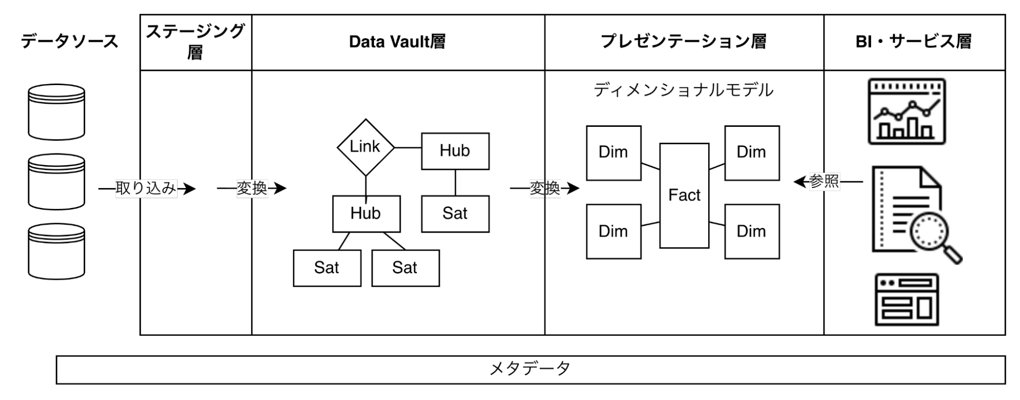 Data Vault(2.0)は、ステージング層とプレゼンテーション層の間に「履歴を保ちつつ統合しやすいモデル」を置くことで、ソース追加や変更に強い中間層を作る考え方です。