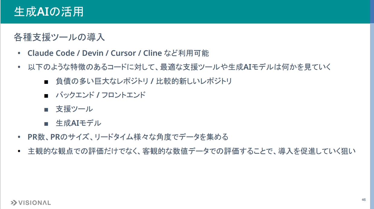 事例として、開発作業での生成 AI活用、まずコーディング支援としての使い方ですが、Claude Code、Cursor、Devinなどを利用可能な環境を整えています。ただ、これを使うと決めきれている状況ではありません。生成 AIはトレンドが毎月のように変わる状況でもあるので、検証を繰り返している段階です。