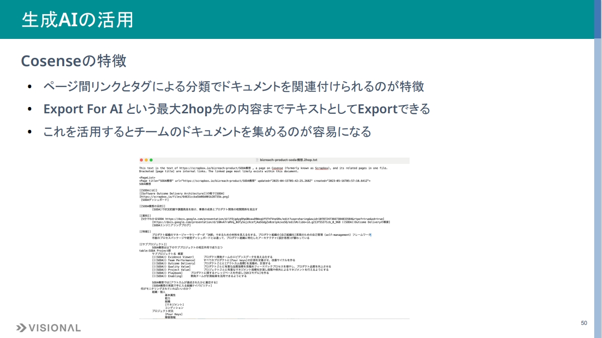 Cosenseの特徴として、ページ間のリンクとタグによる分類でドキュメントを関連付けるのが簡単で強力です。さらに「Export For AI」という機能があり、プレーンテキストで2hop先の内容までエクスポートできます。これによりチームのドキュメントを簡単に集められます。