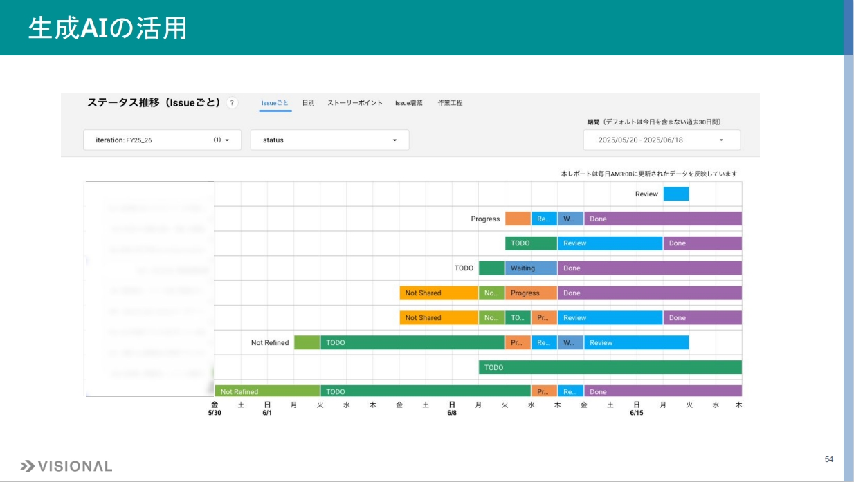 これはタスクのリードタイムを可視化したもので、各タスクがどのステータスにどれくらい時間を要したかをグラフィカルに確認できます。調査タスクのリードタイムが減ってきた傾向や、ドキュメント活用できる箇所と活用できていない箇所の差が広がる様子などが見えてきます。関連ドキュメントが不足している機能が明確になれば、優先度を判断しやすくなると期待しています。