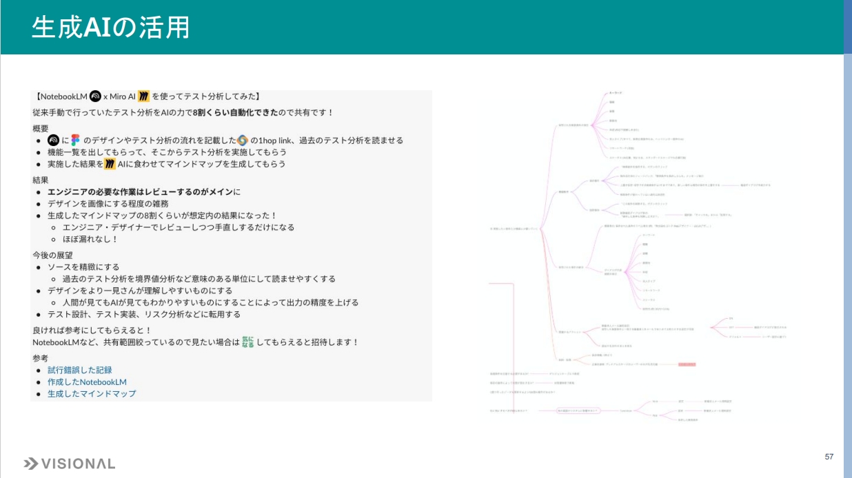 続いて、テスト分析での活用事例を紹介します。生成 AIを活用することで作業の8割を自動化できたという事例です。NotebookLMにFigmaのデザイン、テスト分析の流れを記載したドキュメント、過去のテスト分析例を読み込ませ、その結果をMiro AIにインプットしてマインドマップを生成します。エンジニアはそのマインドマップをレビューするという使い方です。