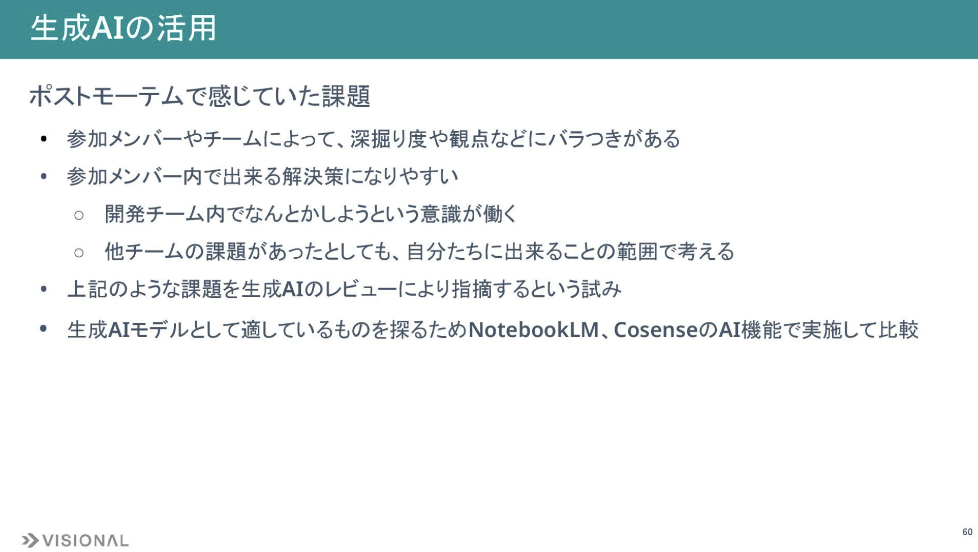 もともとポストモーテムでは、参加メンバーやチームによって深掘り度合いや観点にばらつきがあるという課題があり、議論が参加メンバーの視点に限定されやすいという側面もありました。