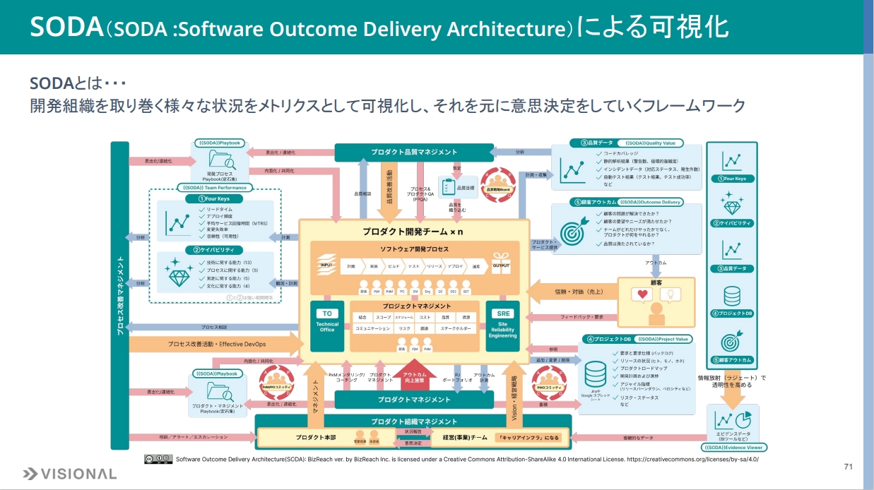 最後はSODA(SODA : Software Outcome Delivery Architecture)による可視化です。まずSODAとは何かを説明します。SODAとは、ビズリーチが提唱しているフレームワークで、開発組織を取り巻くさまざまな状況をメトリクスとして可視化し、それを意思決定に役立てるものです。