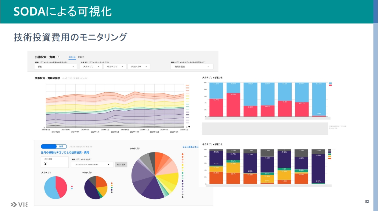 詳細はお見せできませんが、大分類としての費用・投資の比率、中分類の比率、小分類の比率、さらに時系列の推移などを見ることができます。モニタリングするポイントとしては、大項目・中項目・小項目のバランスが意思決定した範囲内にあるか、特にリアーキや基盤整備への投資が意思決定した範囲で推移しているかを見ています。