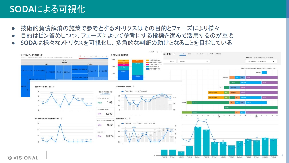 SODAで技術的負債解消のどのようなデータを可視化しているかをご紹介します。技術的負債解消と機能追加のバランス、開発パフォーマンスのモニタリングの2軸でお話しします。