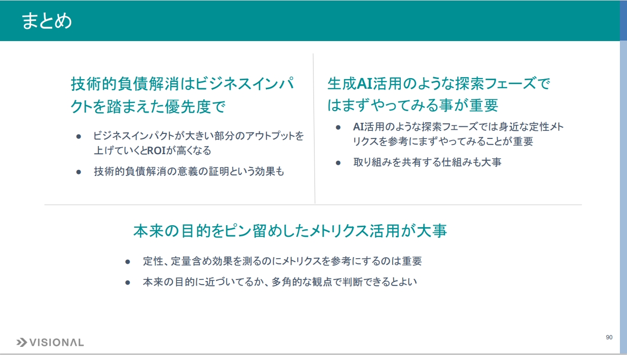 2点目は、生成 AI活用のような探索フェーズでは、まずやってみることが重要な点です。身近な定性メトリクスを参考にまず試し、取り組みを共有する仕組みも大切です。