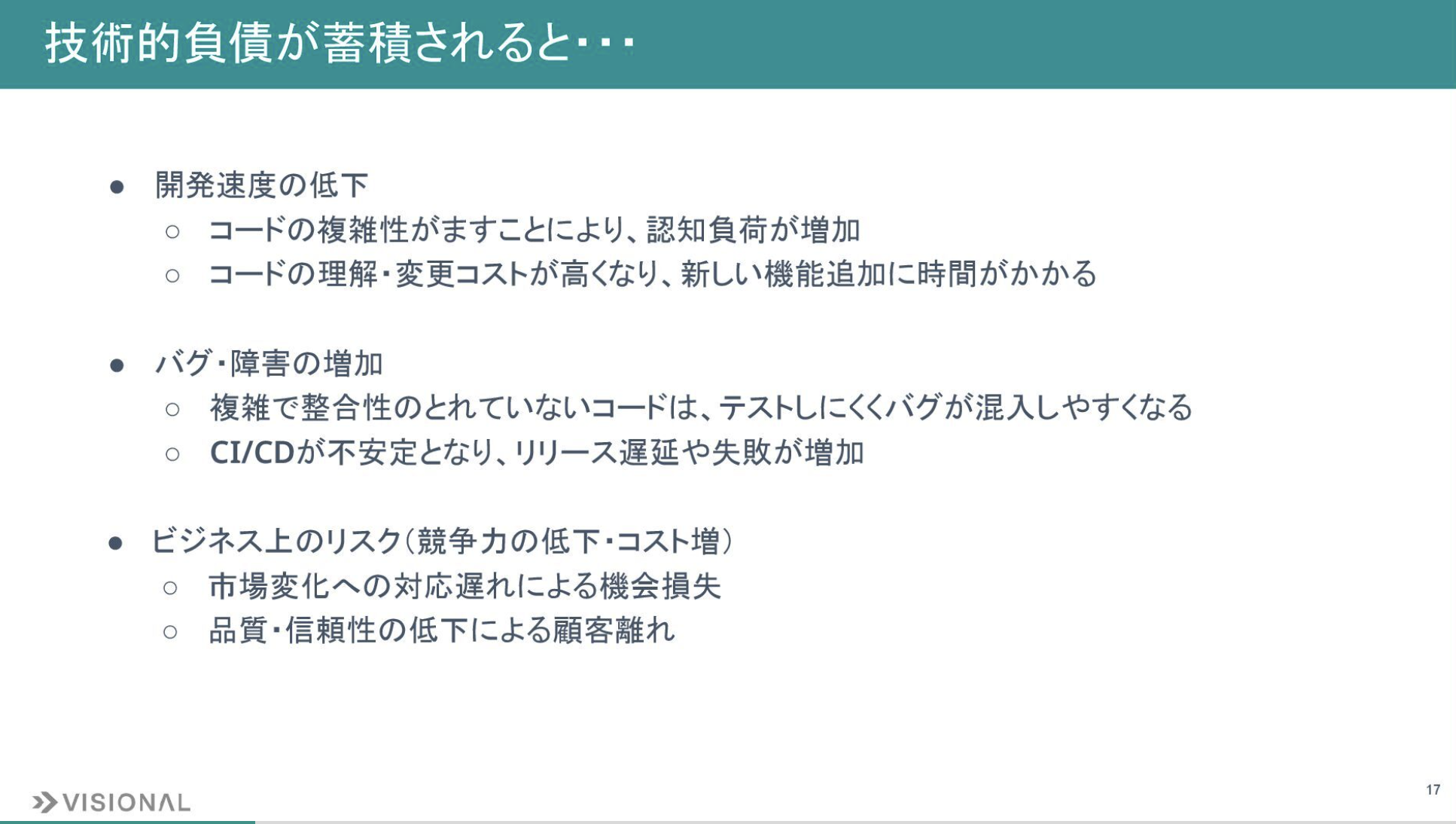 技術的負債が蓄積されると、以下のようなことが起こります。