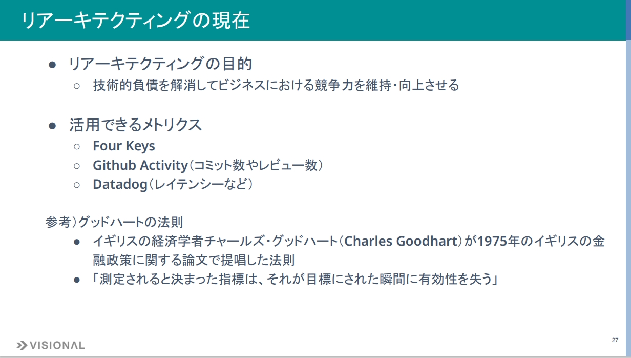 リアーキテクティングでのメトリクス活用方法ですが、目的は技術的負債を解消してビジネスにおける競争力を維持・向上させることです。競争力は抽象度が高く、営業力など開発以外の変数も含むため、開発にフォーカスした定量的メトリクスを見ながら目的を目指すことも重要かと思っています。Four Keys、GitHub Activity、Datadogのレイテンシーなどを参考にしてきました。