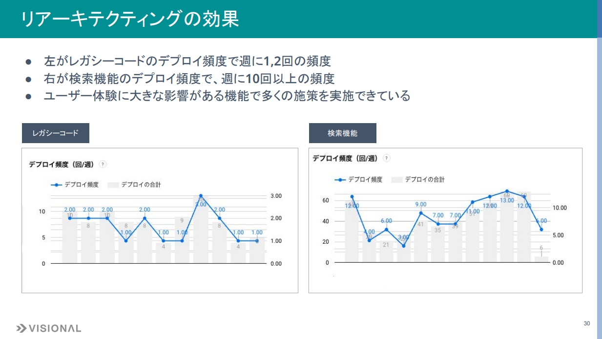 リアーキテクティングとその後のグロースを同じチームが担っていましたが、結果として、リアーキテクティングによって開発スピードは著しく向上しました。左のグラフがレガシーコードのデプロイ頻度で、中央値は週に1〜2回です。一方、右のグラフが切り離してグロースした検索機能のデプロイ頻度で、週に10回以上デプロイしています。検索機能はユーザー体験への影響が大きいため、多くの施策を実施できていることはビジネス的にも非常に大きいと考えています。