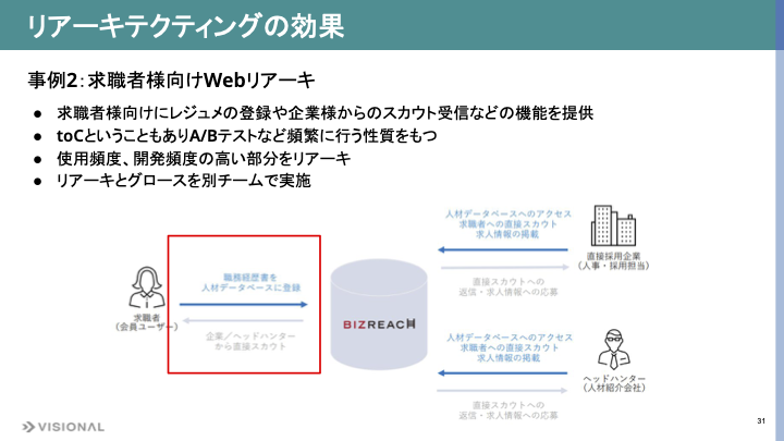 まず、検索機能をリリースした事例をご紹介します。その前に、我々のビジネスモデルを簡単にご説明します。企業様やヘッドハンターの方々が求職者様へ自らアプローチできるプラットフォームを提供しており、求職者の皆様には職務経歴書などの情報をビズリーチ上に登録していただきます。一方で、採用する側の企業様やヘッドハンター様は、それをもとに求める人材を検索します。マッチする方がいればスカウトを送ります。検索の精度、つまり求める人材の検索しやすさはユーザー体験に大きな影響を与える機能です。この部分をレガシーコードから切り離してグロースしています。