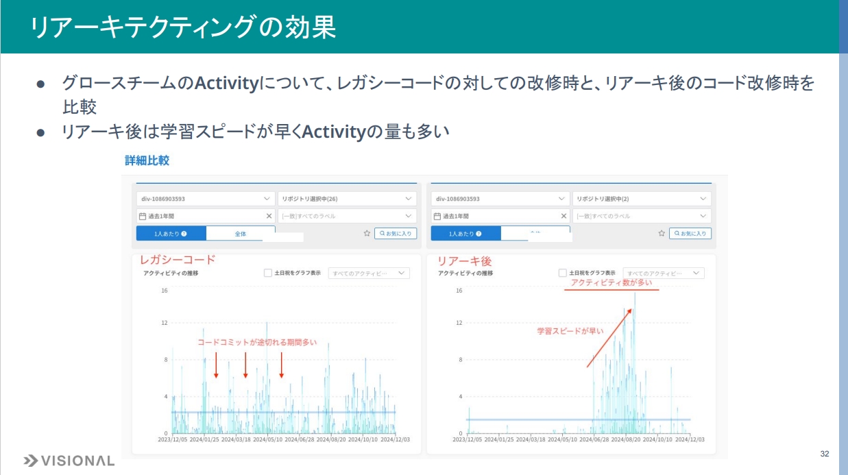 一方で右側は、グロースチームがリアーキテクティング後のコードを触り始めた時のアクティビティです。触り始めは学習期間のためアクティビティが低いのですが、そこからの学習スピードが非常に速く、学習後のアクティビティも多いです。リアーキテクティングした成果が如実に表れていると考えています。