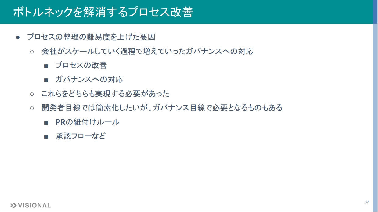 さらに、プロセス整理を複雑にしていた要因として、会社がスケールする過程で増えたガバナンス対応があります。プロセスを改善しつつも、ガバナンス要件を担保する必要がありました。例えばPRの紐付けルールや承認フローについて、このPRはどのイシューに紐付いていて、承認は規定されたフローを満たしているか、といった点です。そういったものは早くリリースしたいという意味では省略したいのですが、ガバナンスとしては非常に重要なものも多々あります。こうした項目がなぜ必要なのかを確認しながら整理していく必要がありました。