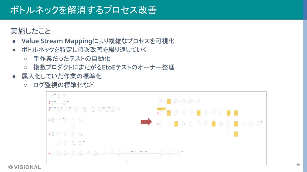 実際に行ったこととしては、まずバリューストリームマッピングで全てのプロセスを可視化し、ボトルネックを順次改善することを繰り返しました。手作業だったテストプロセスの自動化、複数プロダクトにまたがるE2Eテストのオーナー整理、属人化していた作業の標準化などを実施しました。