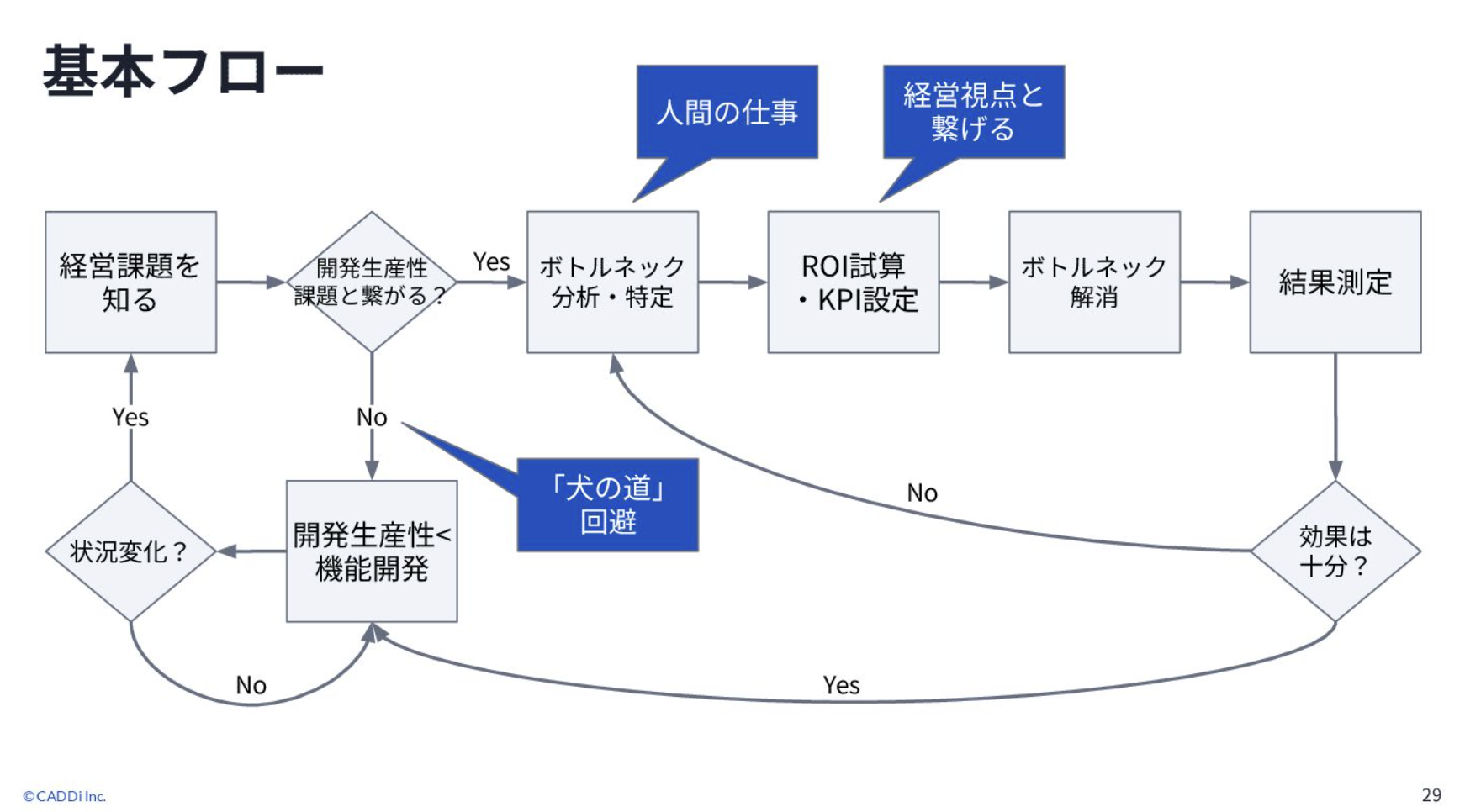 フローで最も重要なのは「開発生産性の課題と経営課題って結びつくのか?」という分岐です。