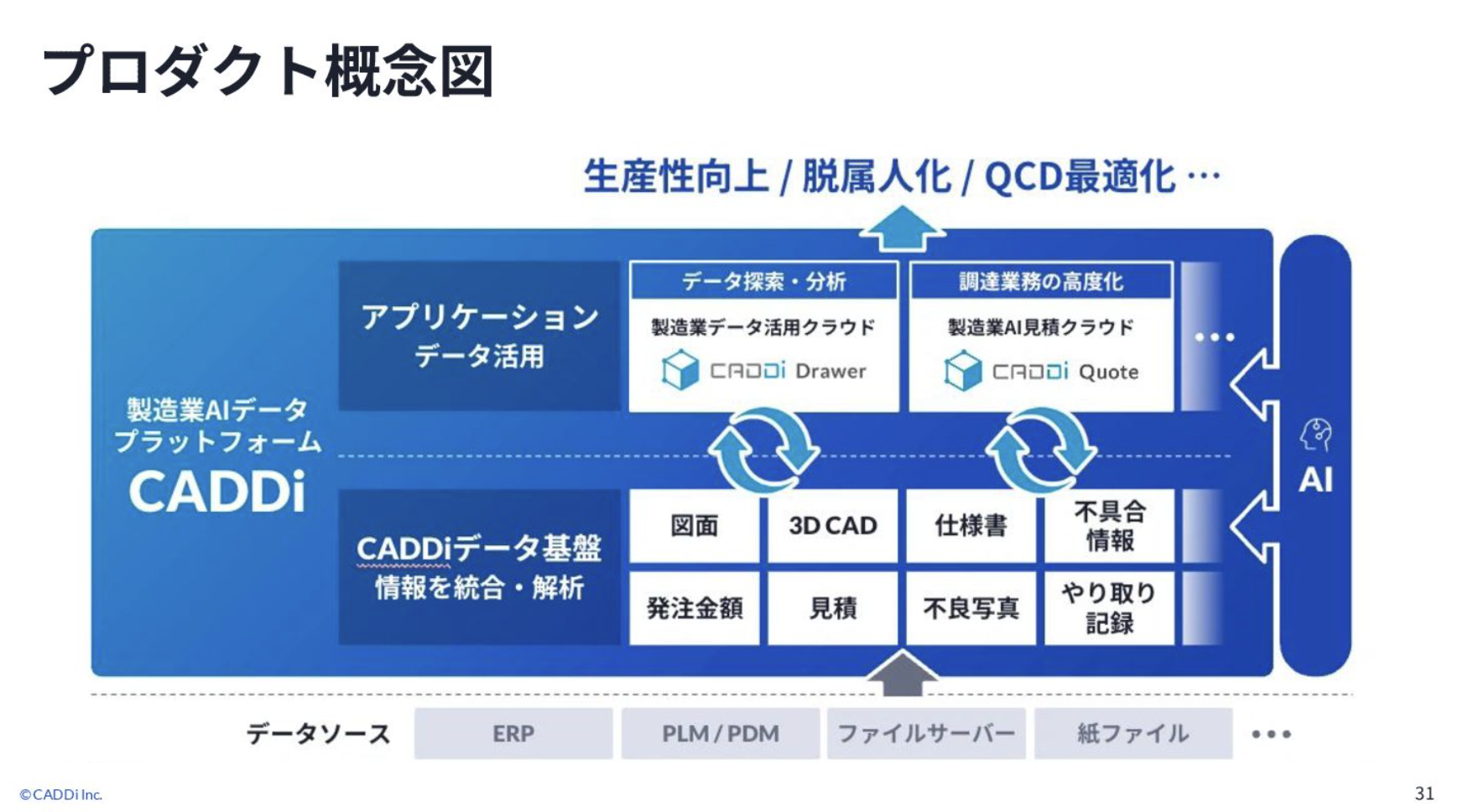 プロダクトの構造は、CADDiデータ基盤に図面、3DCAD、仕様書、不具合情報といった製造業企業の重要な情報資産を集約し、そのデータベースを活用してCADDi DrawerやCADDi Quoteなどのアプリケーションを展開する仕組みになっています。