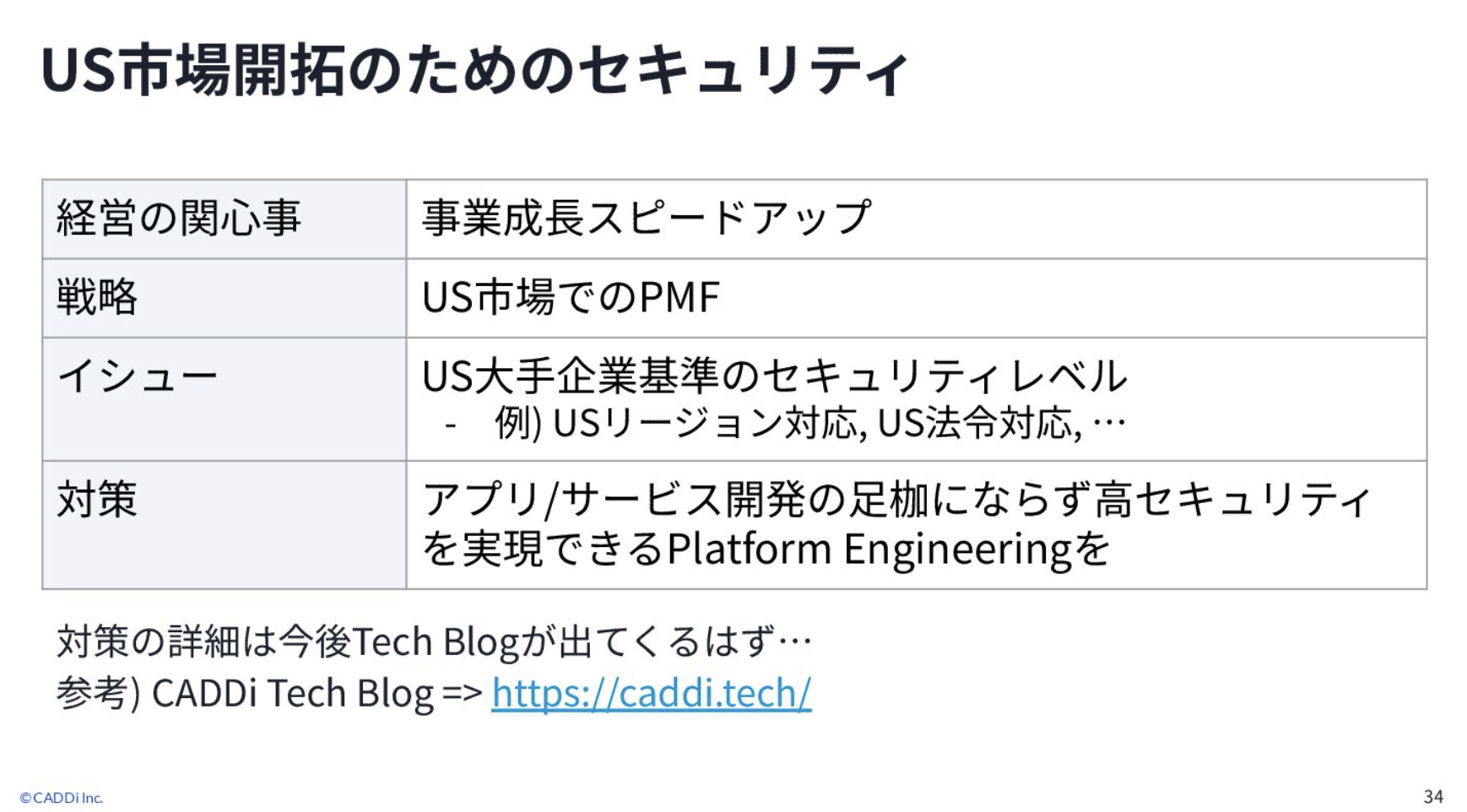 意外な課題として浮上したのが、US大手企業水準のセキュリティレベルです。キャディは日本では名だたる大企業に利用いただいており、セキュリティレベルも万全ですが、アメリカではUSリージョン対応やアメリカ独自の法令対応など、追加要件への対応が必要になります。