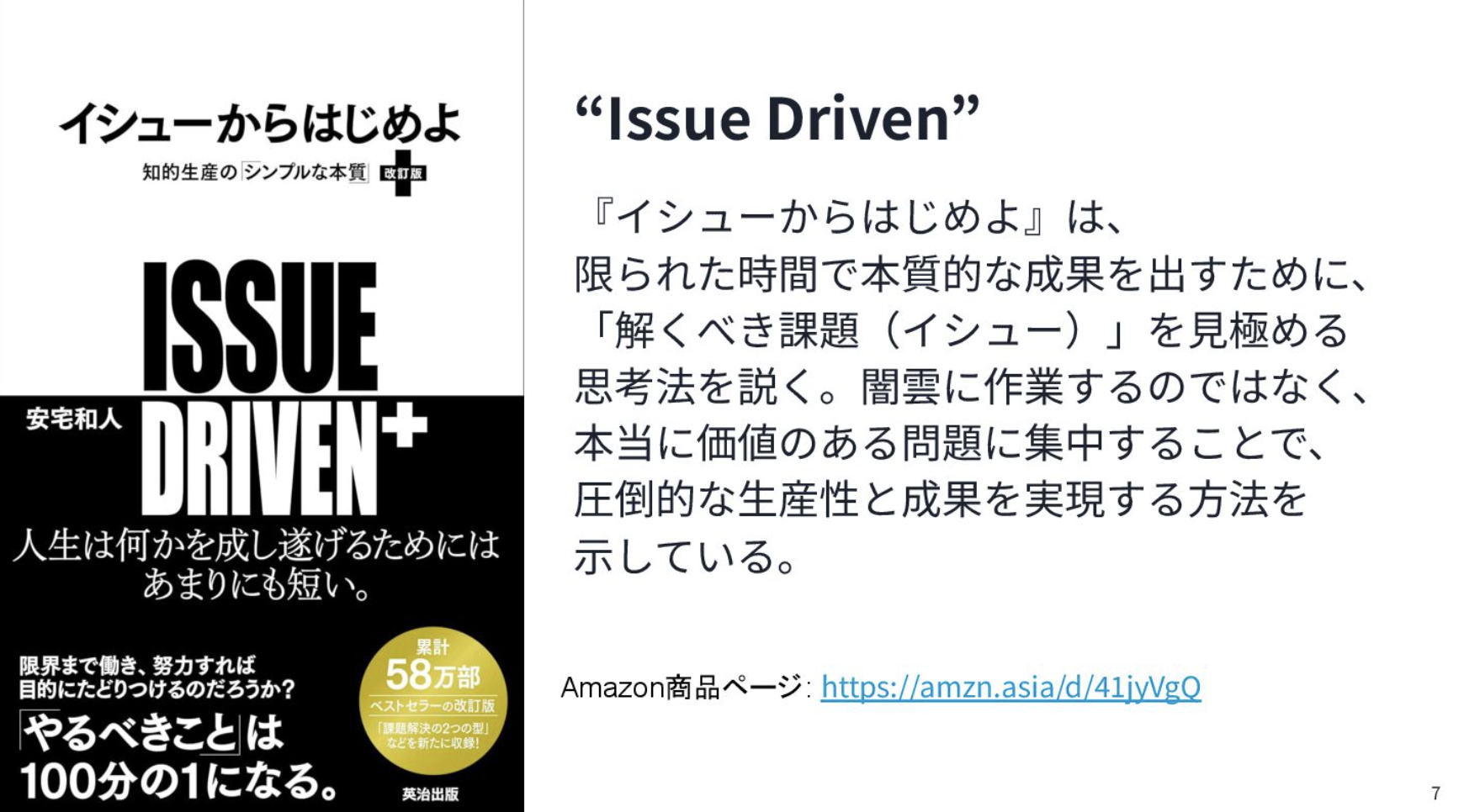 この「Issue Driven」という言葉について、少し説明させてください。これは『イシューからはじめよ』という本から引用した言葉です。この本は2010年の発刊なので、もう15年前の本になりますね。我々のようなソフトウェアエンジニアのような知的労働者の中では、結構古典になりつつある本かなと思います。今でもめちゃくちゃいい本なので、読んだことがないという人がいたら、ぜひ手に取ってみていただきたいです。