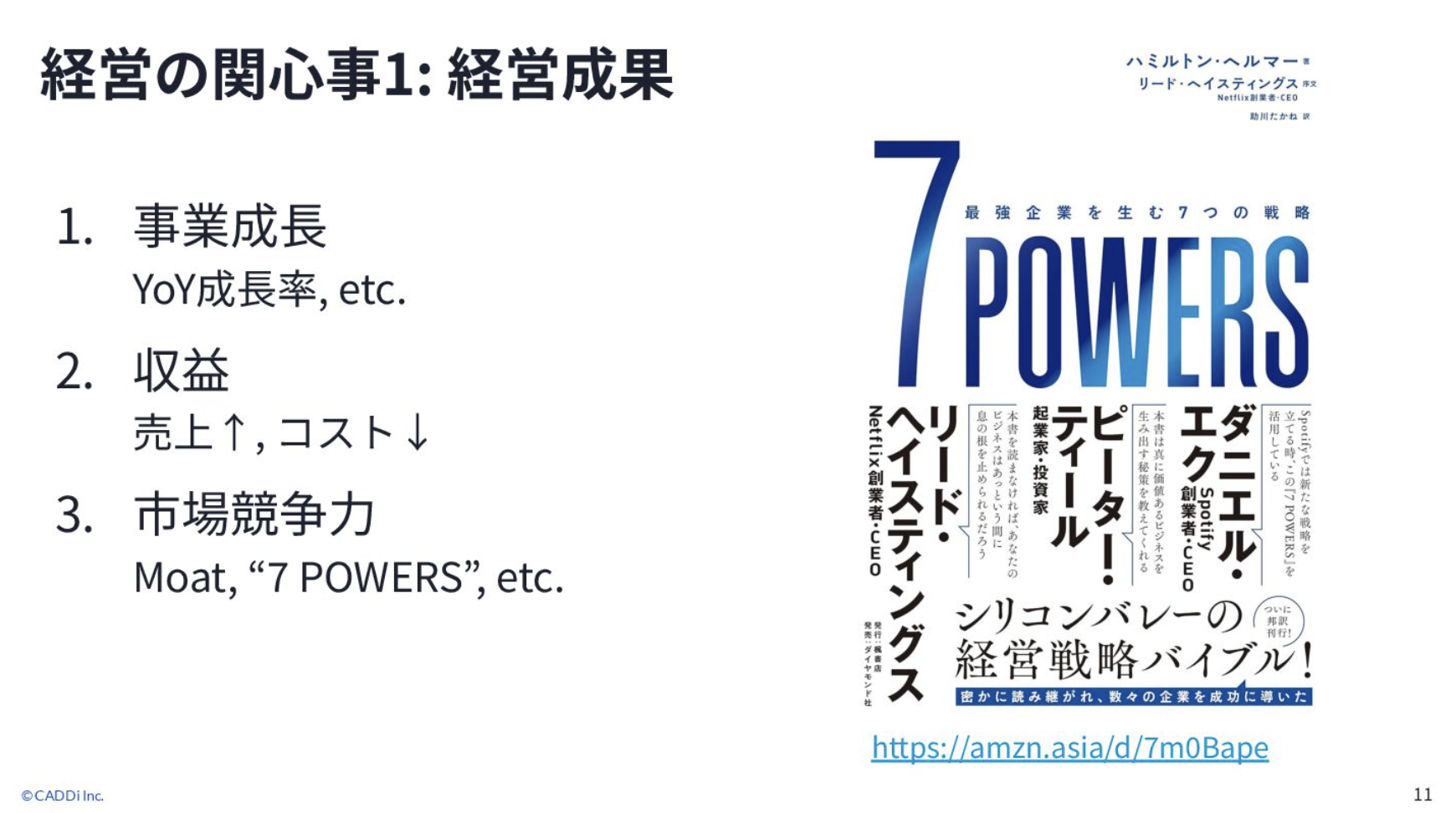 具体的には3つの要素があります。1つ目が事業成長で、YoY成長率などの指標で測られます。2つ目が収益で、売上の向上とコストの削減が含まれます。3つ目が市場競争力で、Moatや「7 POWERS」といった概念で表現される競争優位性のことです。