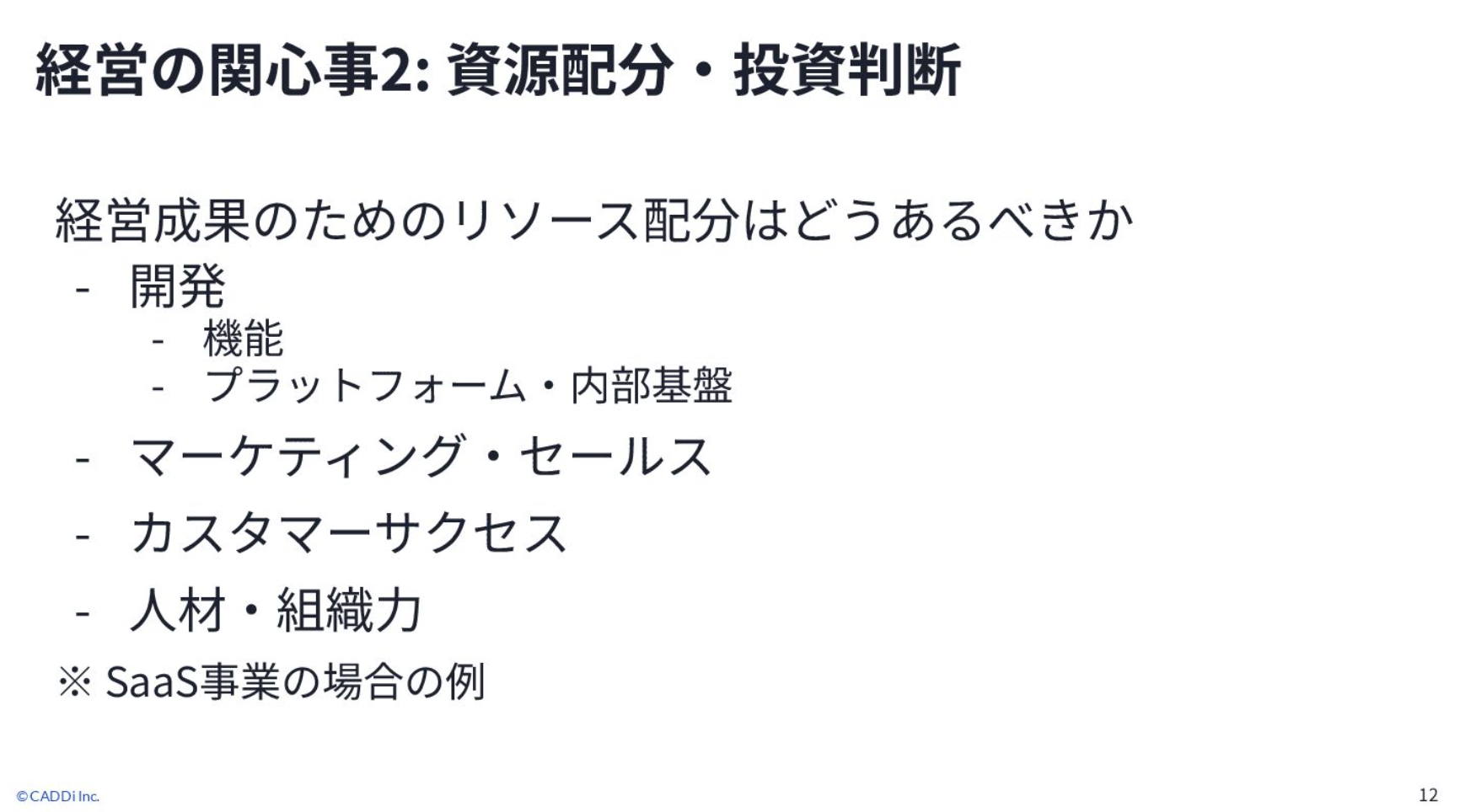 SaaS企業を例に取ると、限られた予算を開発に投入するのか、マーケティング・セールスに投入するのか、人材・組織力の向上に投入するのかという選択が常に求められます。また、人員をどこにどれだけ配置するかという判断も必要です。複数事業を展開している会社であれば、事業間のリソース配分バランスも重要な意思決定となります。