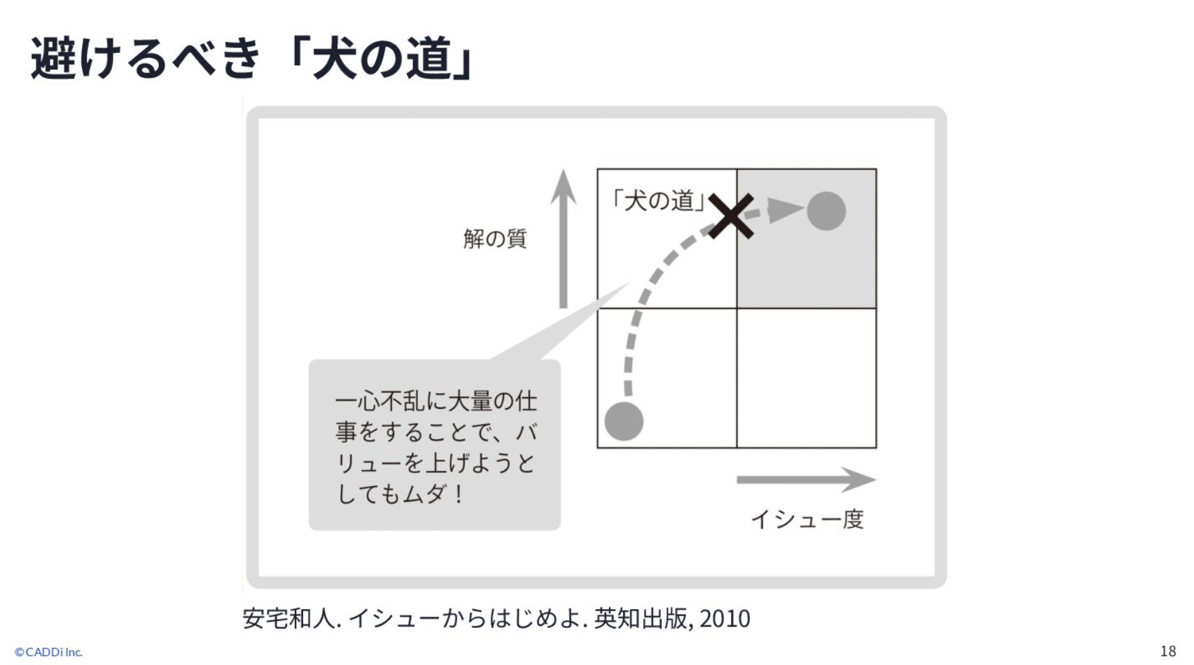 ここで改めて、『イシューからはじめよう』という本からの重要な概念をご紹介します。この本では避けるべき「犬の道」について言及されており、その中で極めて重要な指摘がされています。「一心不乱に大量の仕事をすることで、バリューを上げようとしても無駄である」ということです。