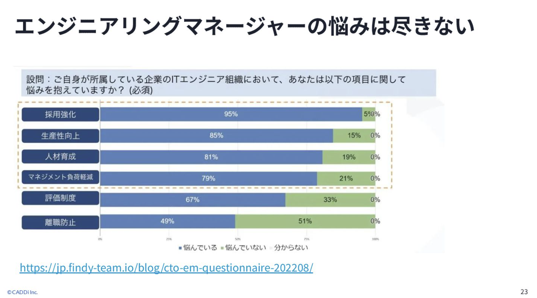 ファインディのアンケートによると、100人のエンジニアリングマネージャーとCTOのうち、採用強化に95%、生産性向上に85%の人が悩んでいます。この背景には、エンジニアリングマネジメントの成果が見えづらいという問題があります。