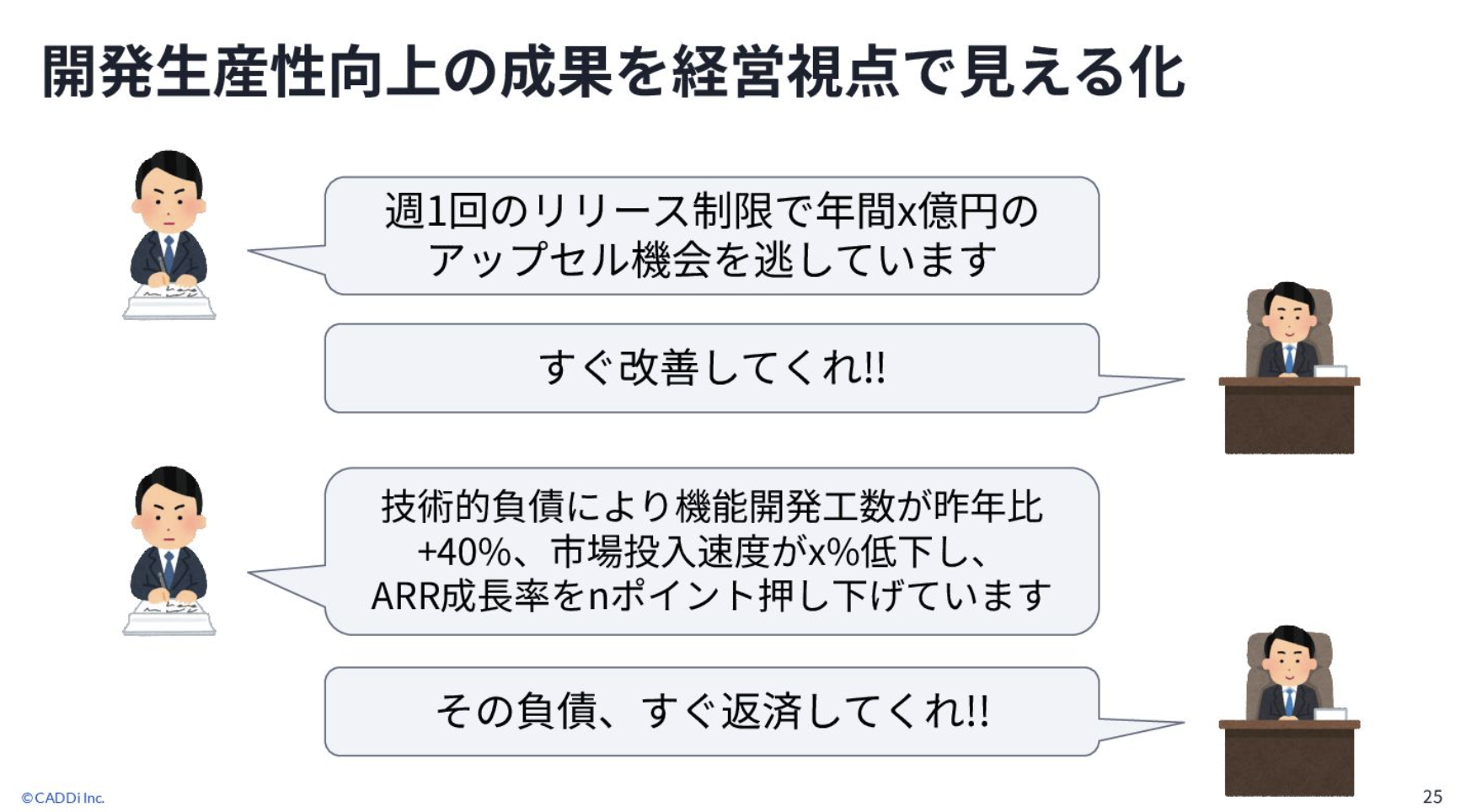 従来の「技術的負債が溜まっています」「テストを自動化する必要があります」という表現に対して、経営視点では「週1回のリリース制限で年間x億円のアップセル機会を逃しています」「技術的負債により機能開発工数が昨年比40%増加、市場投入速度がx%低下し、ARR成長率をnポイント押し下げています」と表現できます。