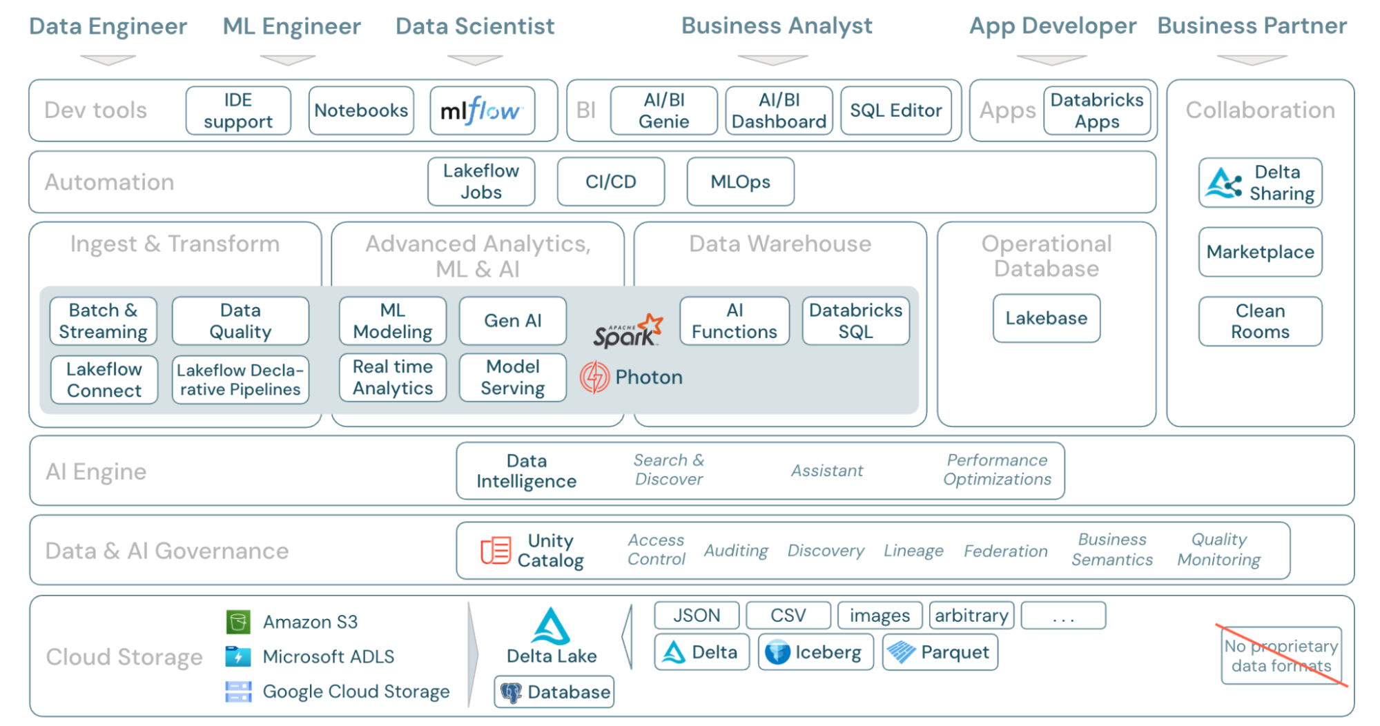 そこでDatabricksは「レイクハウス」を発明しました。レイクハウスはDWHの機能とデータレイクの利点を組み合わせたデータ基盤アーキテクチャです。これにより、構造化データ・非構造化データを一つのデータ基盤で扱うことが可能になります。また、単にデータをため込むだけではなく、統合されたデータガバナンス機能であるUnity Catalog、Databricks自らが開発した高い信頼性と処理性能を備えたDeltaLakeフォーマットを土台に、データエンジニアリング・AI/BIの機能も豊富に用意されています。