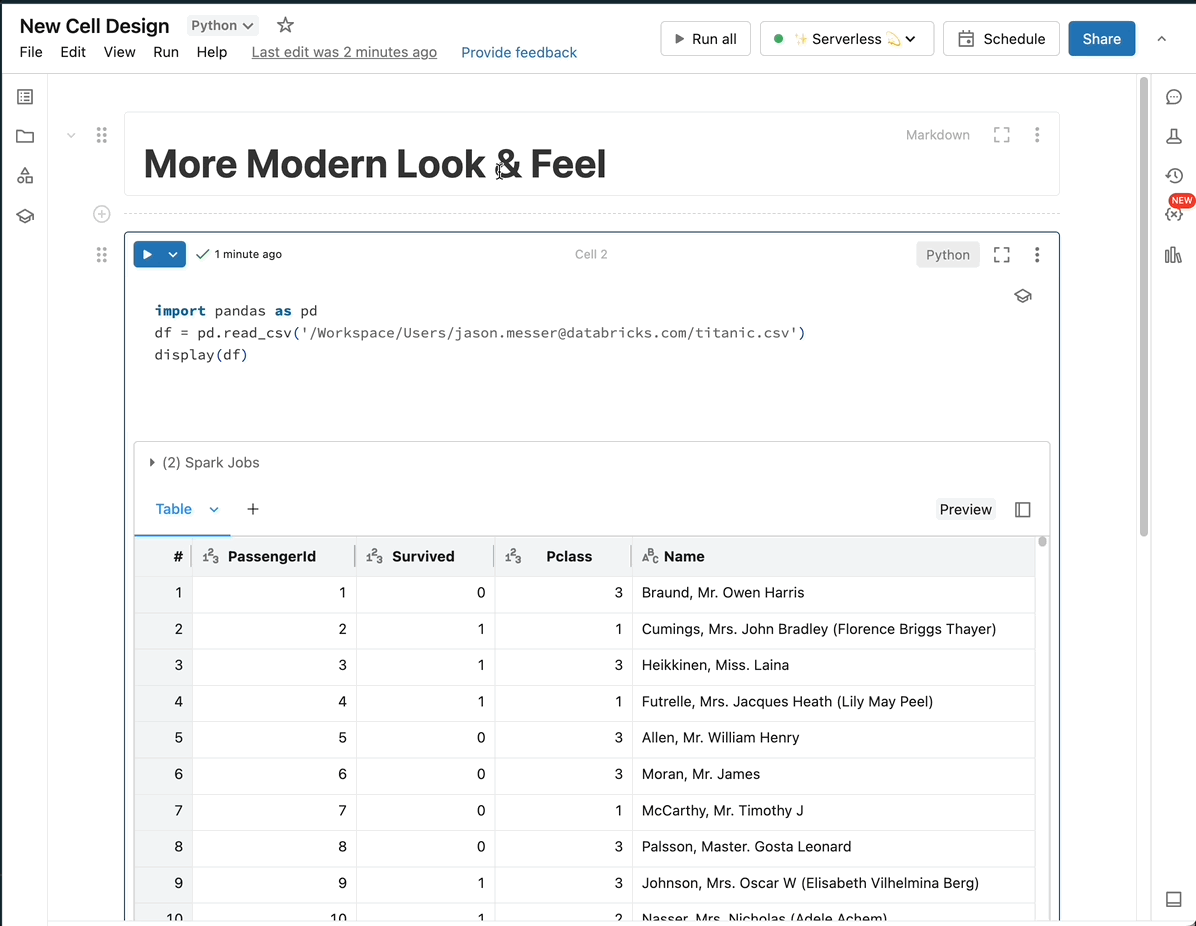 Databricks Notebooksは、Python、SQL、Scala、Rなど複数言語に対応したコードエディタです。セル単位で実行や可視化、Markdownによるドキュメント化、バージョン管理、Git連携、共同編集が行え、Jupyter Notebook以上にエンタープライズ向けのセキュリティやガバナンスを備えています。さらに、ローカルのVisual Studio Codeや他のIDEとの連携も公式にサポートされています。