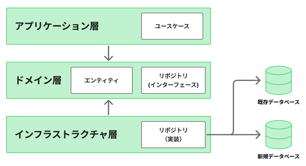 このDB共有を技術的に可能にしているのが、DDDの戦術的設計であるリポジトリパターンです。このパターンは、既存DBへのアクセスや複雑なデータマッピングといった処理を、すべてリポジトリ層(インフラストラクチャ層)に集約しカプセル化するものです。このようにリポジトリ層がデータ構造の差異を吸収する役割を担うことで、ドメインロジック(ドメイン層)を、DBの物理的な構造から切り離しています。これにより、ドメインロジックはビジネスルールに集中したクリーンなモデルを維持したまま開発を進めることが可能になります。