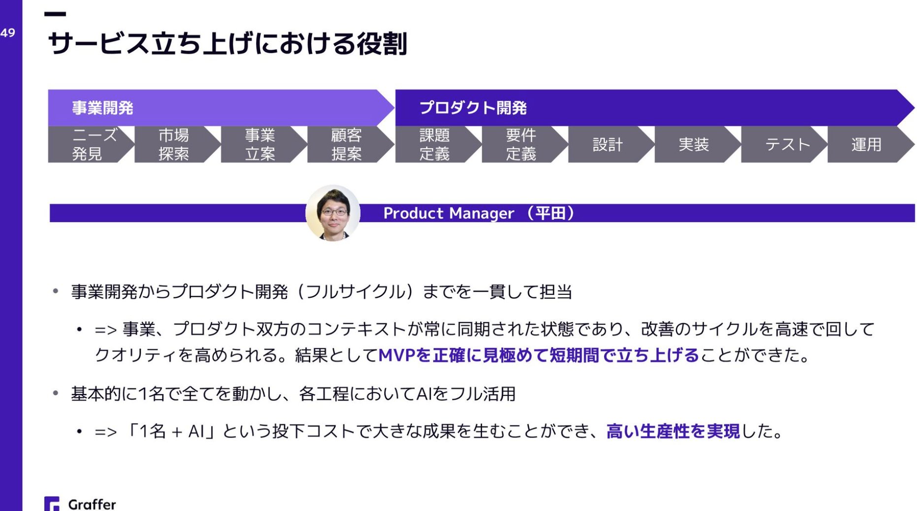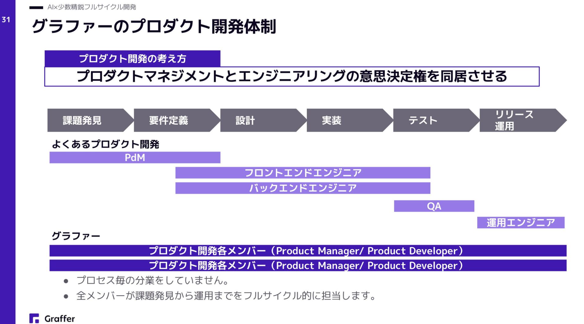 黑﨑:この考え方を開発に適用すると、プロダクトマネジメントとエンジニアリングの意思決定権を同一人物に集約することになります。グラファーでは、課題発見から運用まで、1人のプロダクトマネージャー/プロダクトディベロッパーが全責任を負う体制を構築しています。