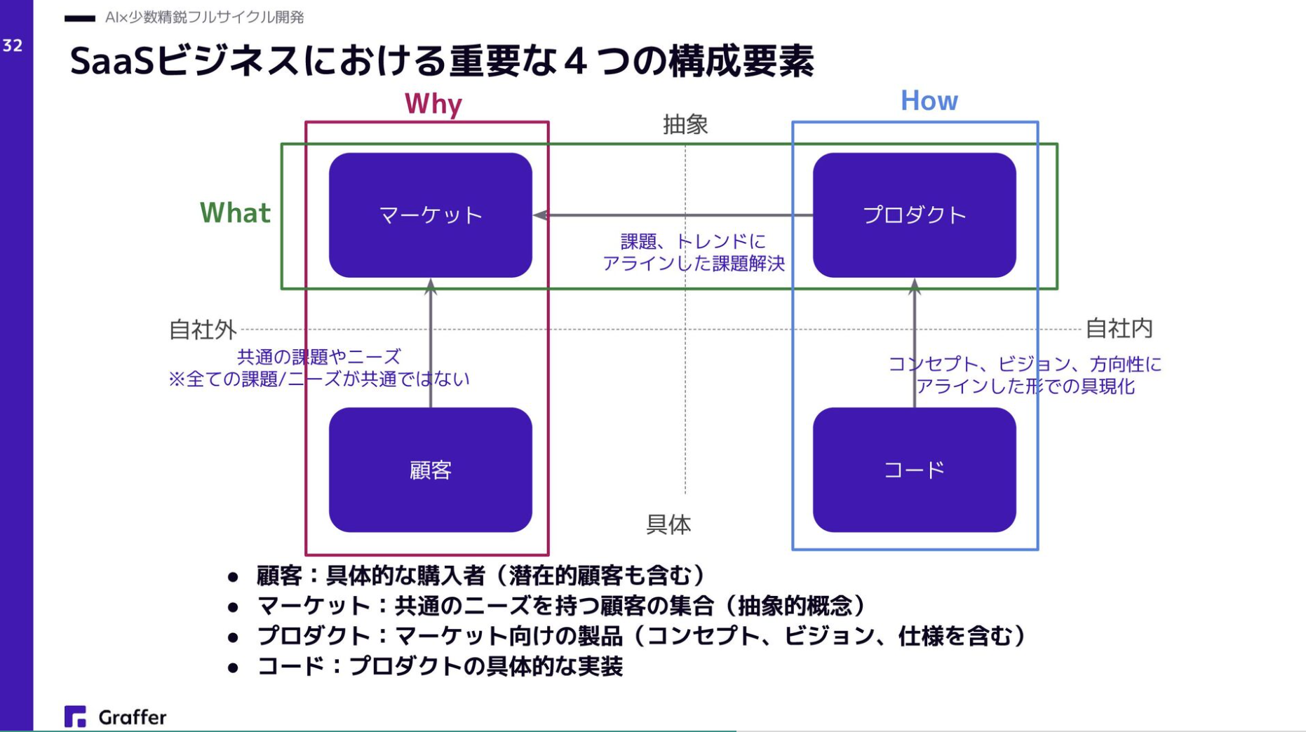 「なぜ作るのか」(Why)は、マーケットの顧客との向き合いによってのみ理解可能です。「何を作るのか」(What)は、マーケットが求める機能の特定です。「どう作るのか」(How)は、プロダクトのビジョンに基づく具体的実装になります。