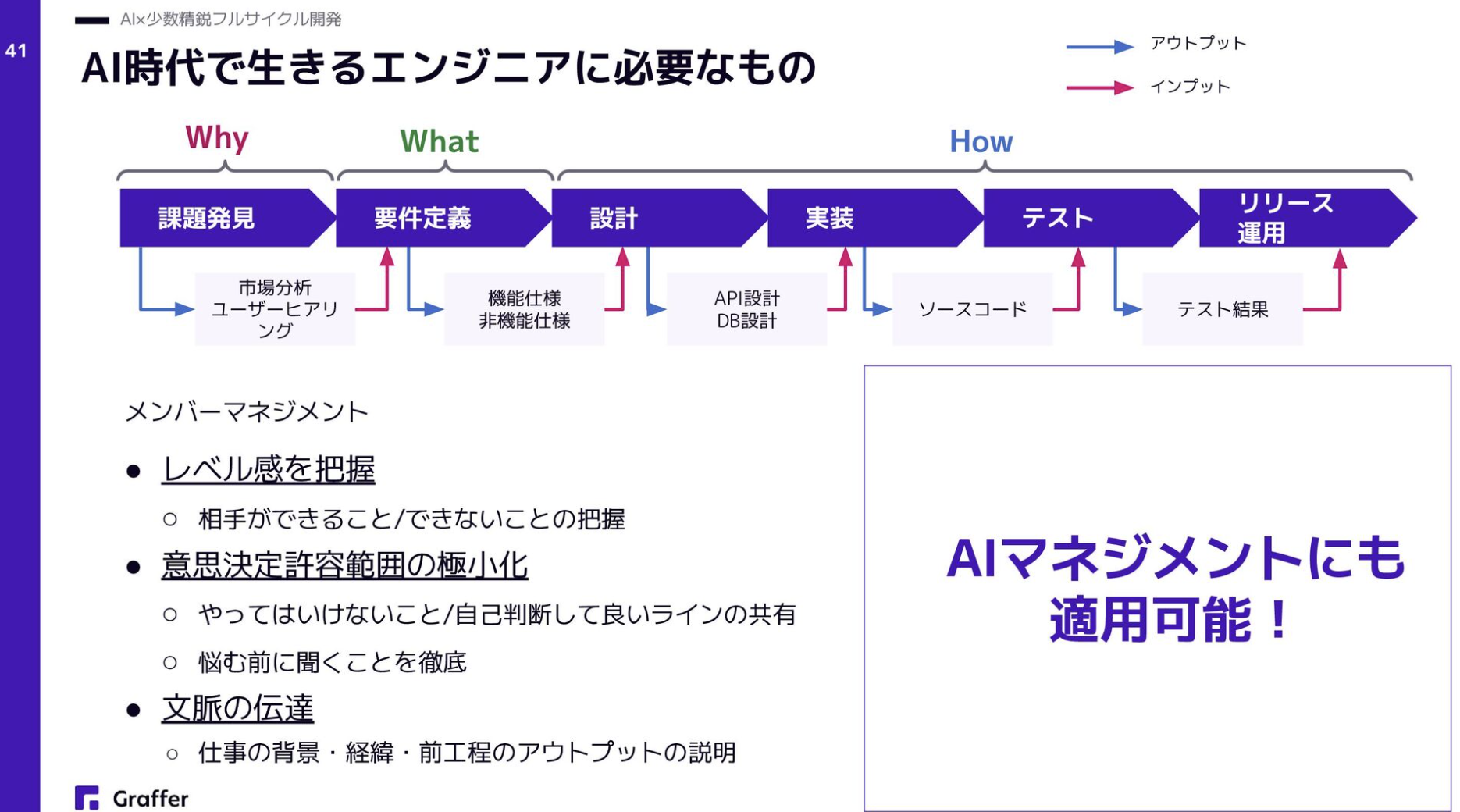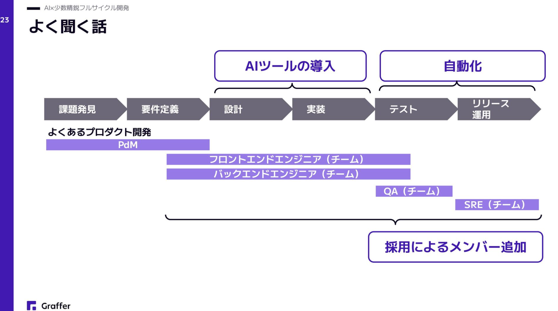 そこで今回は、開発生産性2000%達成を目指してAIを前提とした開発プロセスとマネジメントを実践するグラファー独自のアプローチをご紹介します。