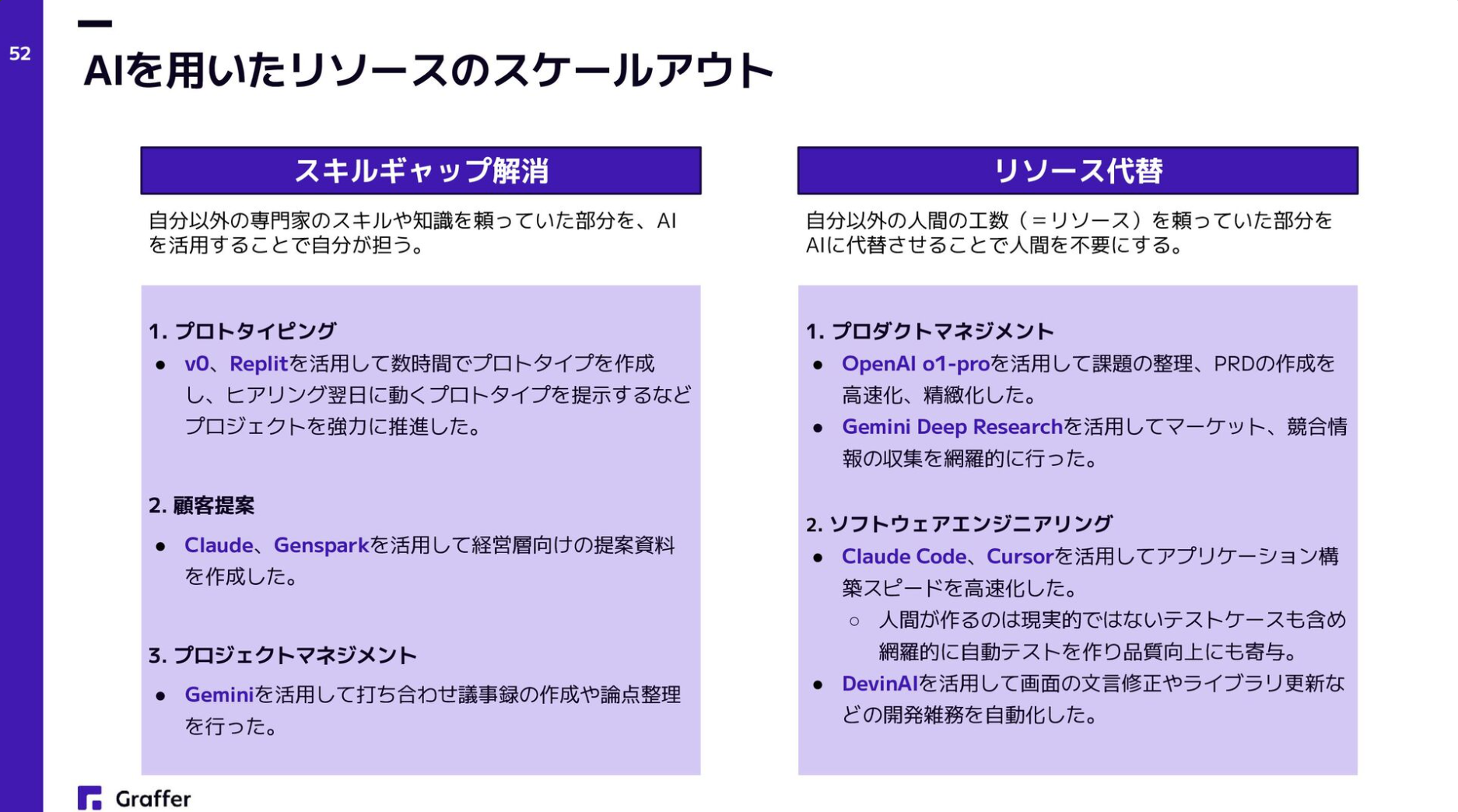 リソースの代替では、プロダクトマネジメント、企画をまとめるところでo1 Pro等を使って企画書を作ったり、エンジニアリングの部分ではClaude Codeを使ったり、一部Devin AIも使いました。軽微なものであればDevin AIに任せて、私が食事をしている間に処理してもらうといった感じで、リソースを並列で走らせられるように工夫しました。