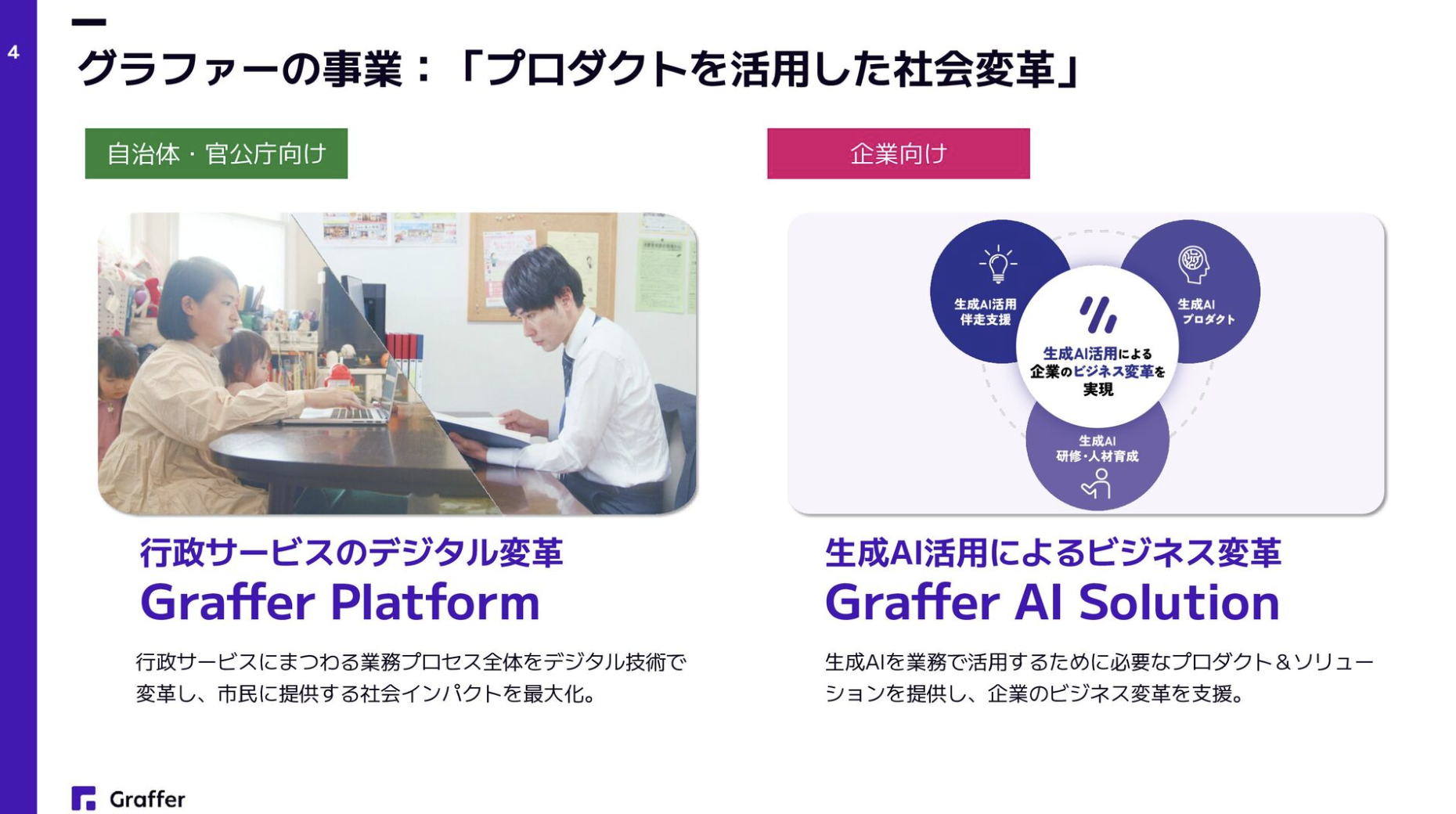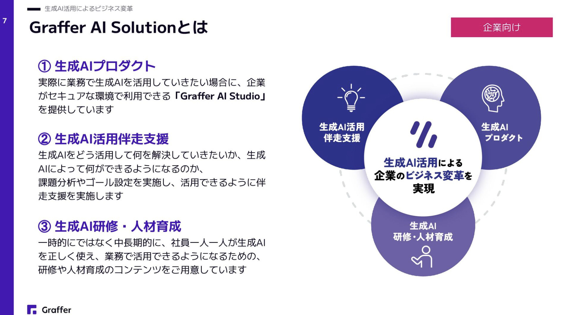 もう1つが、2023年から展開している民間企業向けの「Graffer AI Solution」です。これは生成AIを活用したビジネス変革を支援するソリューションです。こちらは3本のサービスをまとめて1つのソリューションとして提供しています。