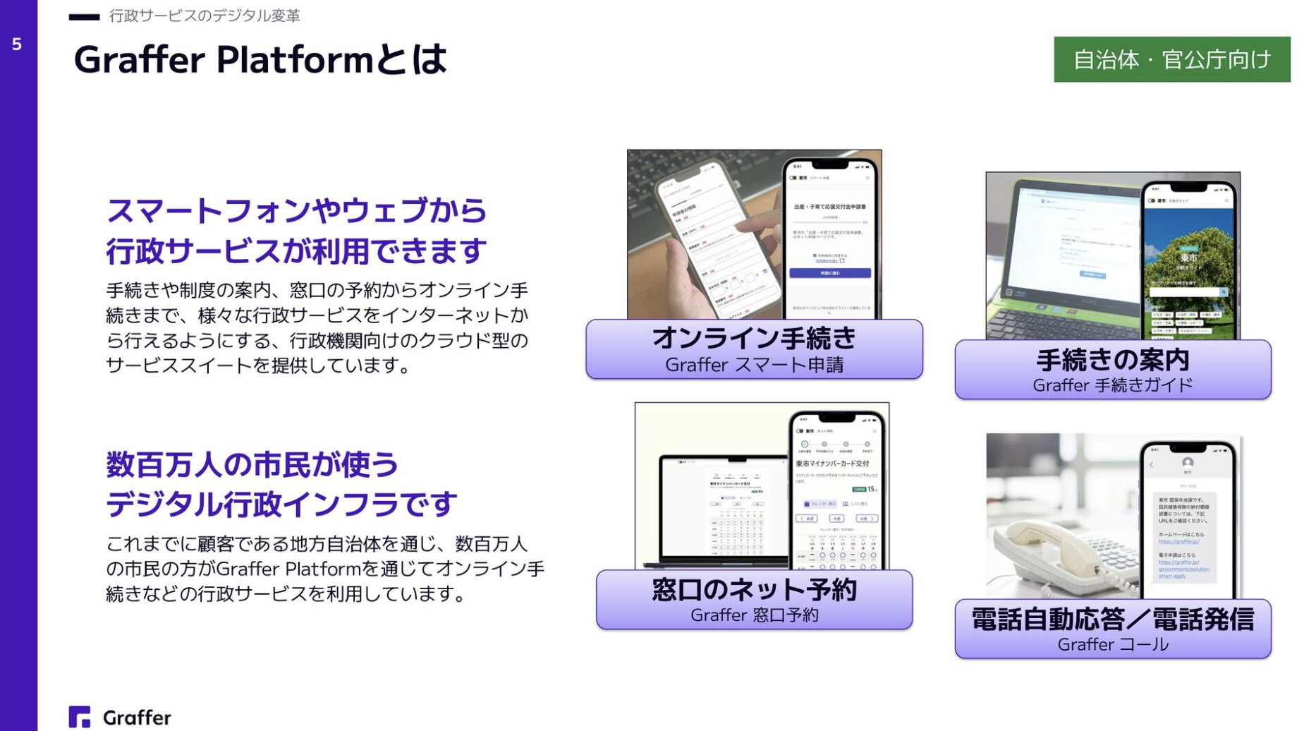 黑﨑:1つ目が、今では社会インフラとして当たり前になってきた行政サービスのデジタル変革を担う「Graffer Platform」です。皆さんも引っ越しやお子さんの誕生といったライフイベントの変化で関わることがあると思います。