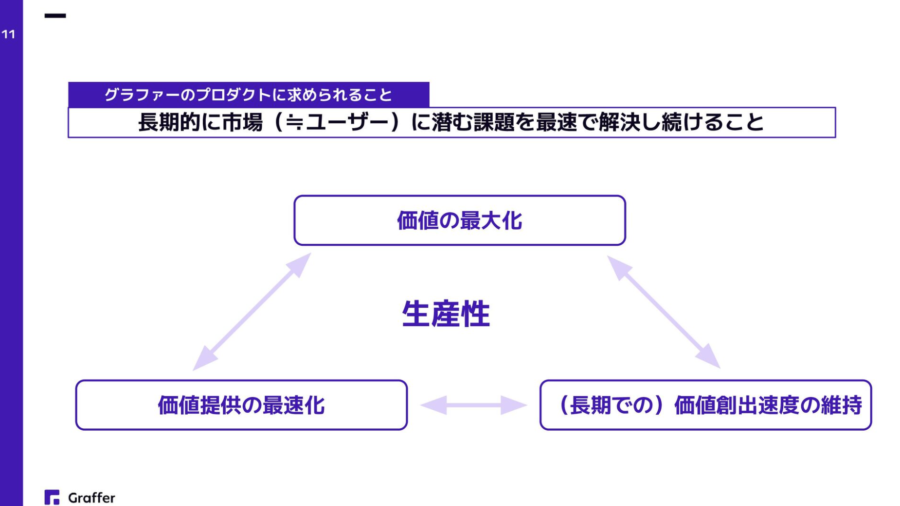 グラファーのプロダクトに求められることは、おそらく皆さんにとっても共通する話だと考えています。企業がプロダクト事業として取り組んでいく中で、長期的なゴーイングコンサーンの中でプロダクトを提供して対価を得ていく、つまり市場に潜む課題に価値を提供することによって対価を得ていくことが、現在我々が取り組んでいることです。