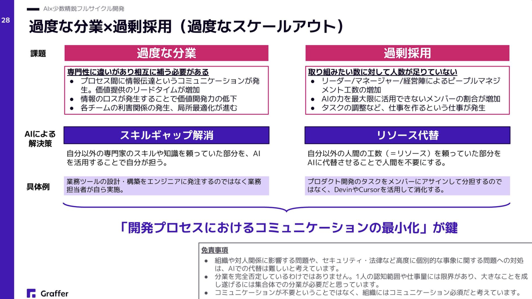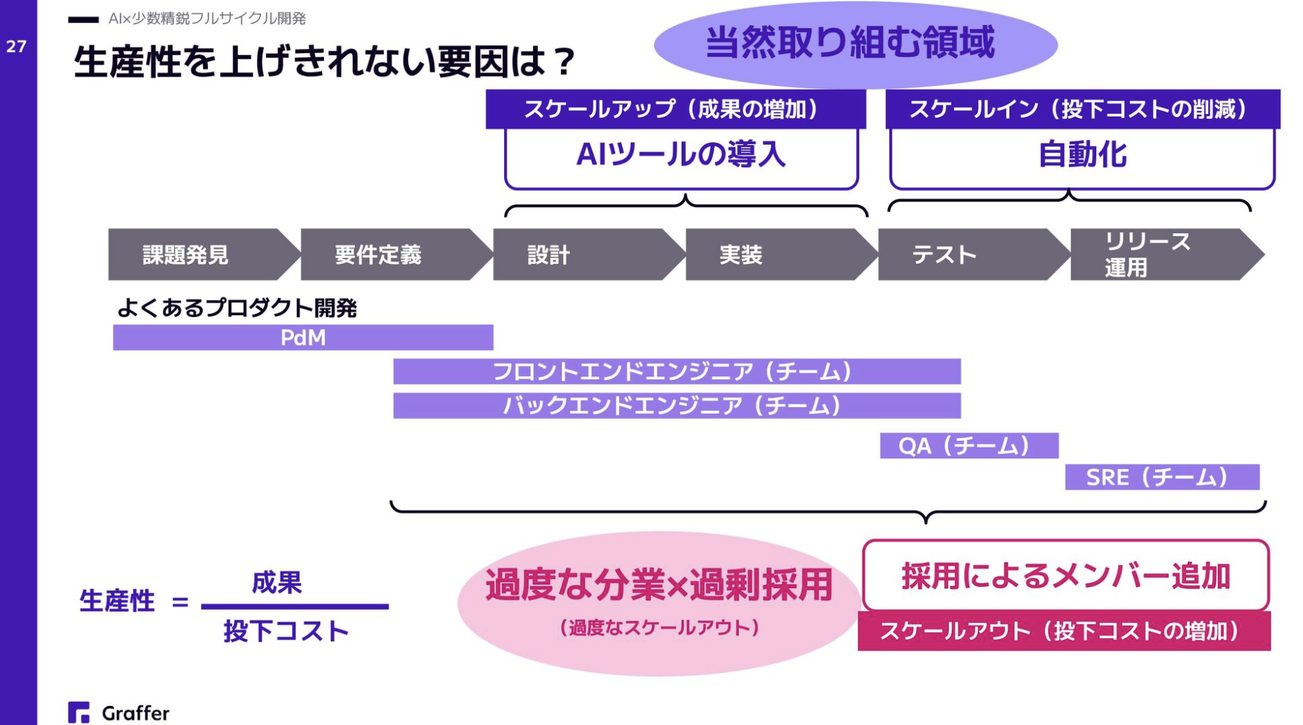 グラファーでは、スケールアップとスケールインは当然取り組むべき領域である一方で、過度な分業と過剰採用、つまり「過度なスケールアウト」が生産性向上を阻害する要因になっていると考えています。