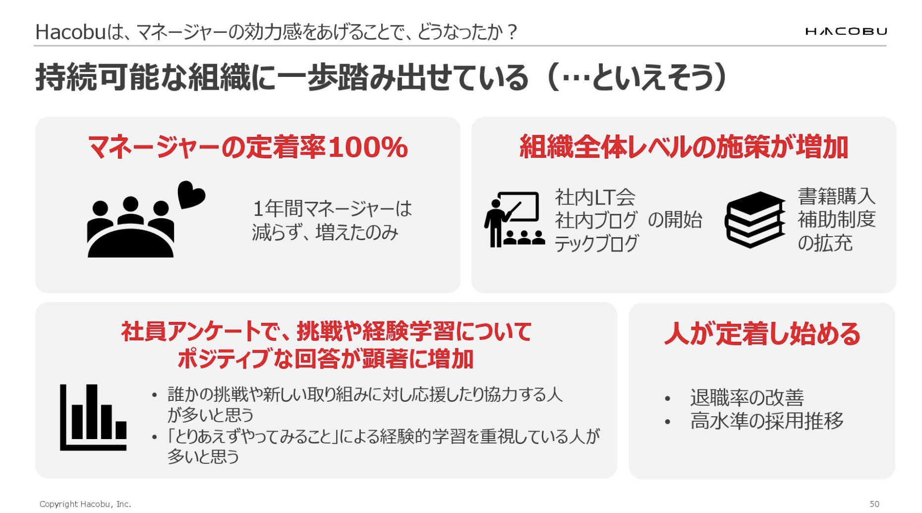 本日は、マネージャーの効力感向上のための4つの施策についてお話ししました。これらの施策により、マネージャーの孤独感という課題から「自分ならできる!」という状態への変化を実現できました。