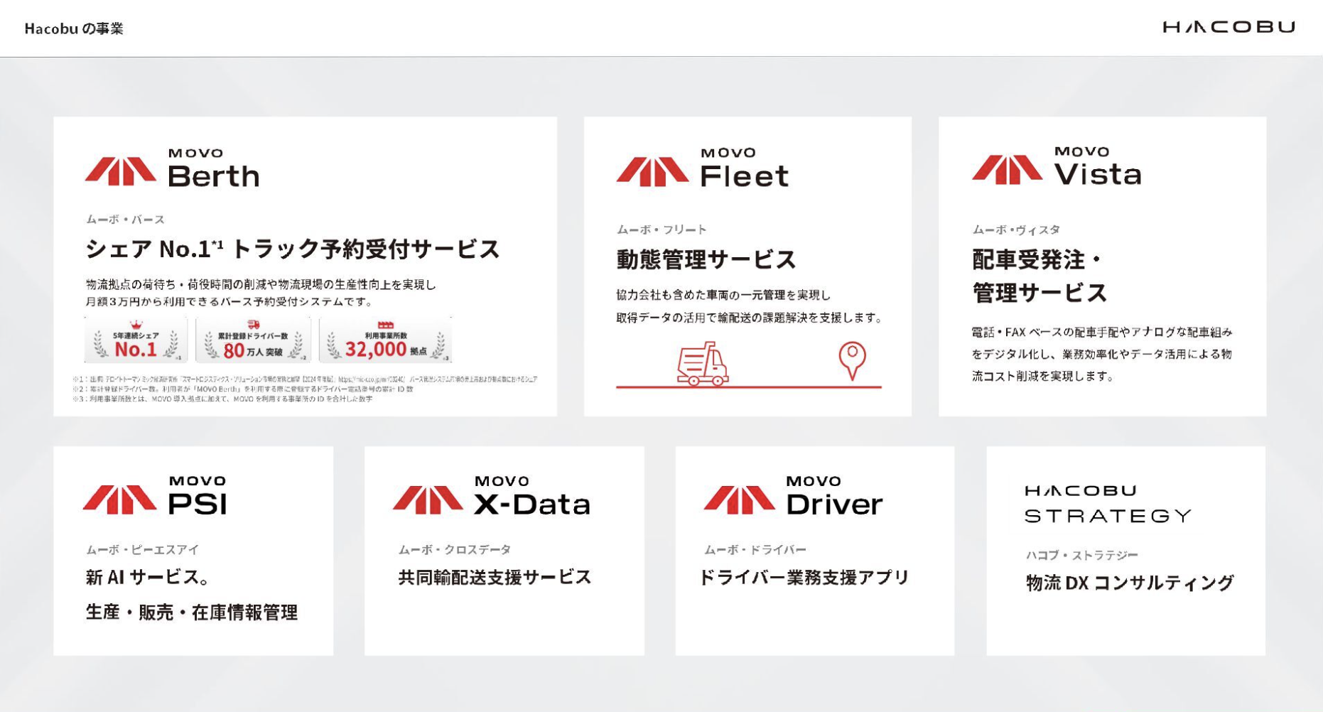 こうした課題に対して、私たちHacobuでは6つのSaaSプロダクトを提供しています。トラック予約受付サービスの「MOVO Berth」、動態管理サービスの「MOVO Fleet」、配車受発注・管理サービスの「MOVO Vista」などです。これらのプロダクトとコンサルティングを通じて、物流業界全体の効率化と最適化に取り組んでいます。
