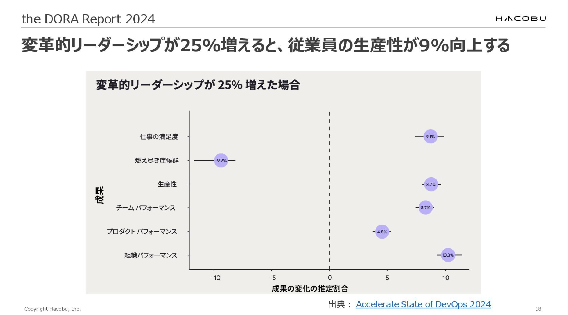 この点については、DORA Report 2024でも「変革型リーダーシップ」として、マネージャーの重要性に言及されています。変革的リーダーシップが25%増えると、従業員の生産性が9%向上するという調査結果も出ており、マネージャーがうまくチームを鼓舞できれば、チームの生産性が向上することがデータでも裏付けられています。