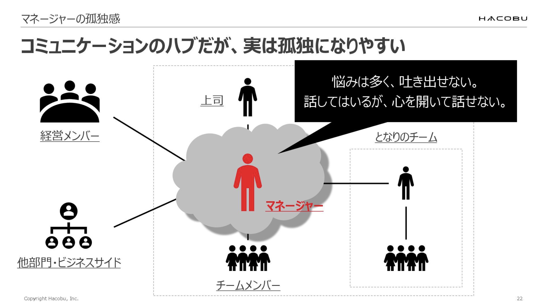 特に深刻なのが、マネージャーの孤独感です。マネージャーはコミュニケーションのハブという重要な役割を担っていますが、実は非常に孤独になりやすいポジションでもあります。様々なステークホルダーとの接点を持ちながらも、悩みが多くて吐き出せない、話してはいるが心を開いて話せないという辛い状況に陥りがちです。
